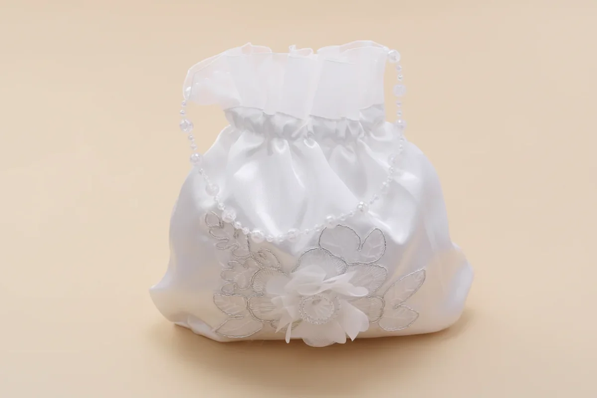 Pochette de Baptême Satinée – Fleur Brodée & Poignée Perlée
