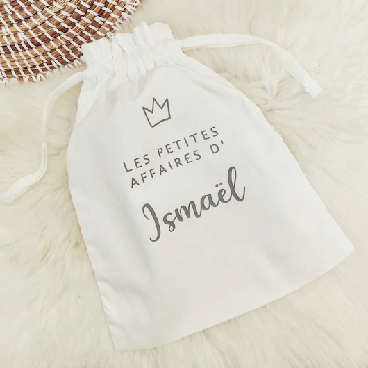 Un joli pochon en coton bio personnalisé qui sera idéal notamment pour y glisser la tenue naissance de votre petit bout et qui pourra par la suite être utilisé pour ranger d’autres articles de votre bébé (produits de soin, brosse, pyjama, sac de crèche etc).