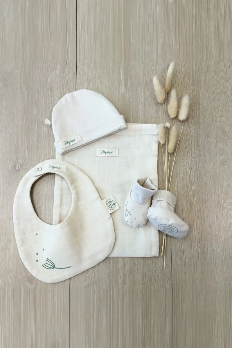 À la recherche d’une idée pour un cadeau de naissance ? Notre pochon de naissance 100% en coton bio comprend: une paire de chaussons et un bonnet en jersey ainsi qu’un mini bavoir en lange et jersey.