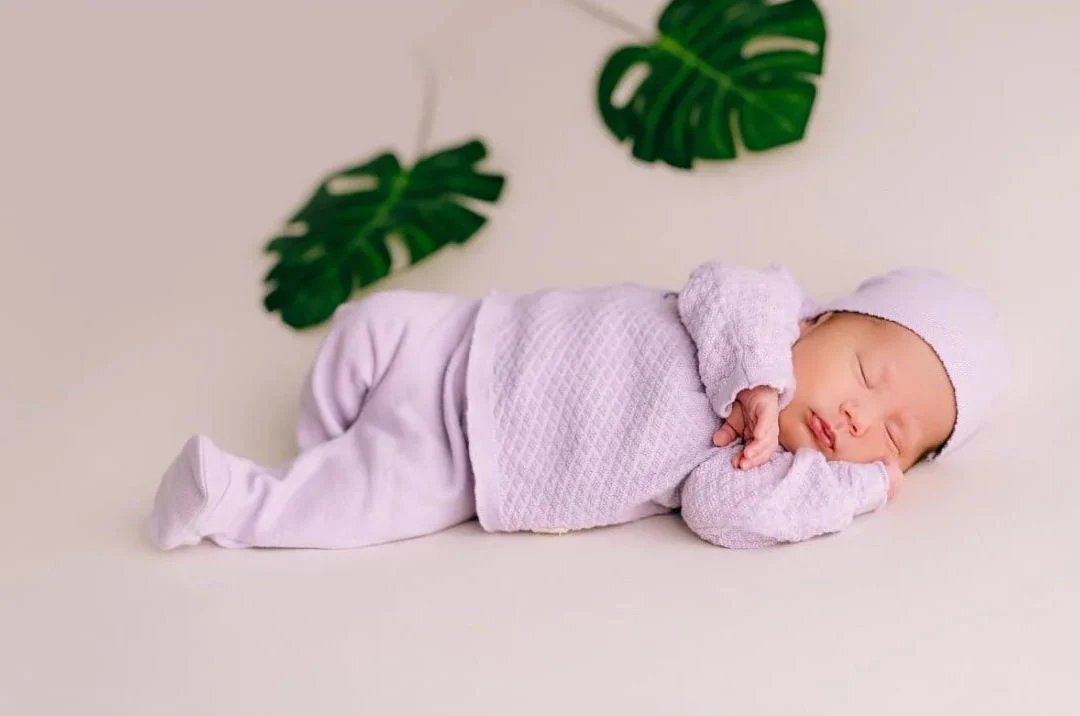 Pochon de Naissance imprimé Lilas (pull, legging & bonnet) Violette