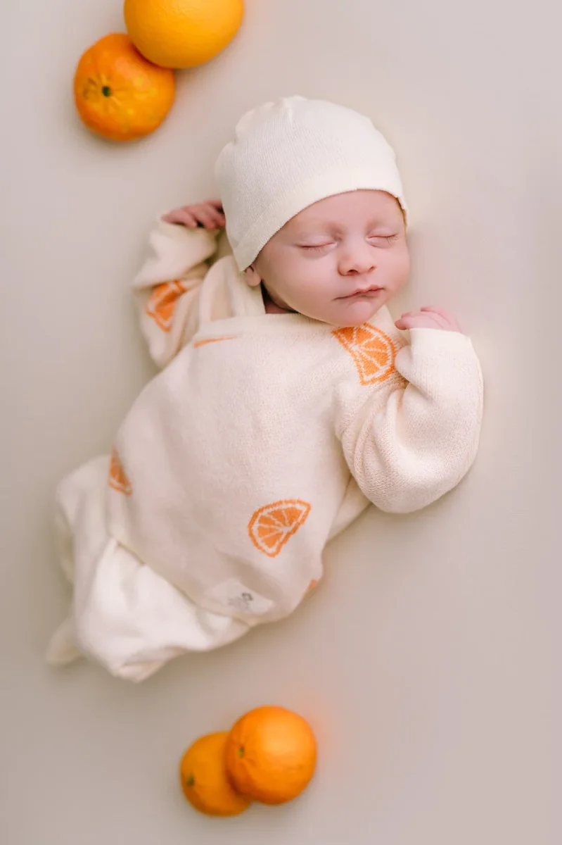 Pochon de Naissance imprimé Oranges (pull, legging & bonnet) Ecru