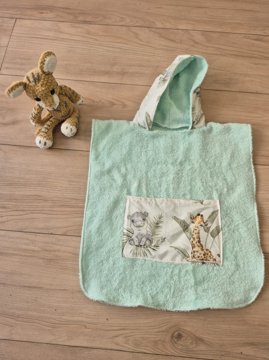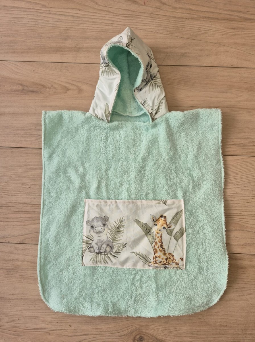 Poncho de bain enfant – éponge vert d’eau & coton imprimé animaux :