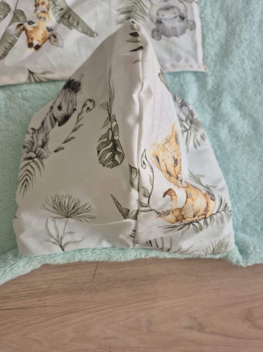 Poncho de bain enfant – éponge vert d’eau & coton imprimé animaux