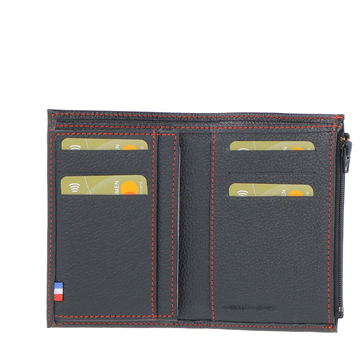 Notre portefeuille compact peut se glisser dans une poche avant ou arrière de pantalon. Il est élégant avec ses surpiqures rouge qui lui donne un coté sport. Il contient 6 cartes de crédits, il a un volet permis de conduire et carte d’identité, une fente sur le dessus portefeuille et enfin un porte monnaie original zippé sur le coté. Très pratique, il deviendra un indispensable. De plus il est fabriqué en France dans une jolie vachette grainée qui est très résistante.