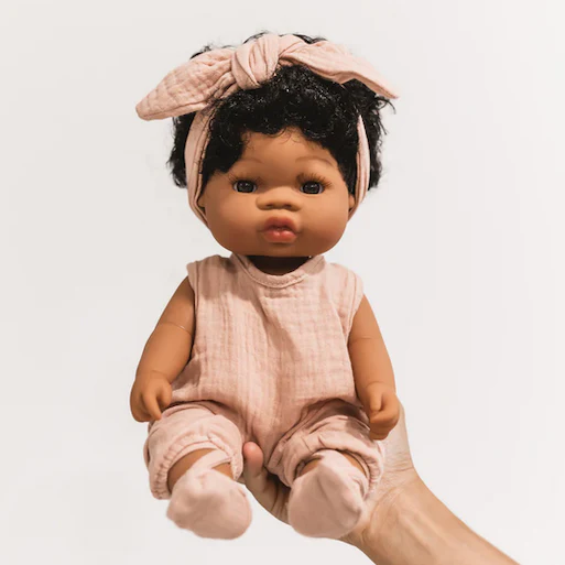 Chaque poupée comprend un ensemble de sous-vêtements, un bandeau, une combinaison et une paire de chaussures fabriquées à la main au Portugal en tissu 100% gaze de coton.