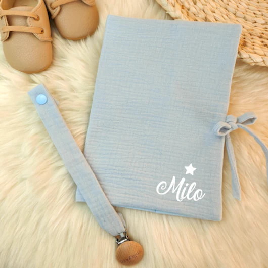 Voici un joli protège carnet de santé matelassé en gaze de coton, entièrement confectionné par nos soins avec le plus grand soin.