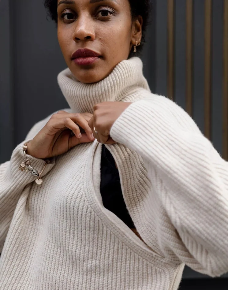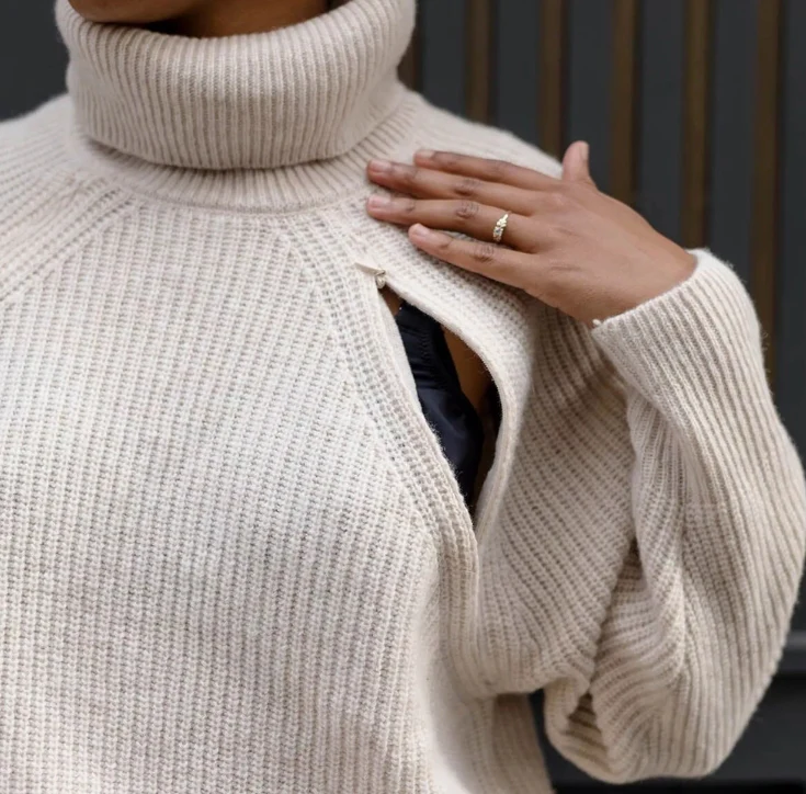 Un pull d’allaitement à col roulé comme un vrai doudou moelleux, pour allaiter confortablement et bien au chaud !