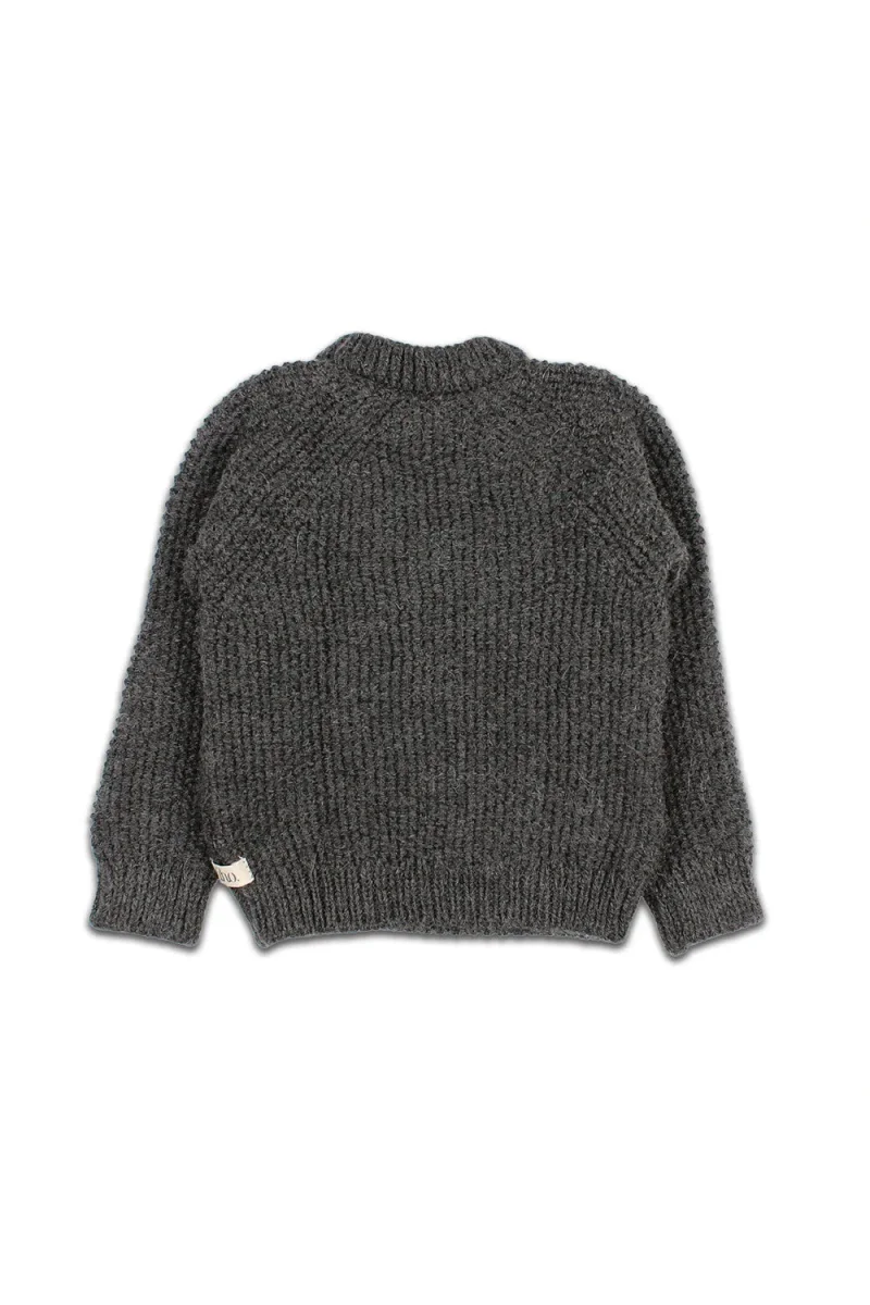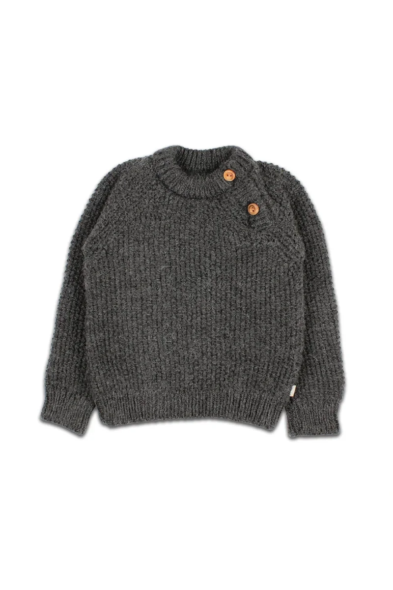 Pull tricoté au point de riz. Col rond. Manches raglan. Deux boutons en bois pour un ajustement facile.
