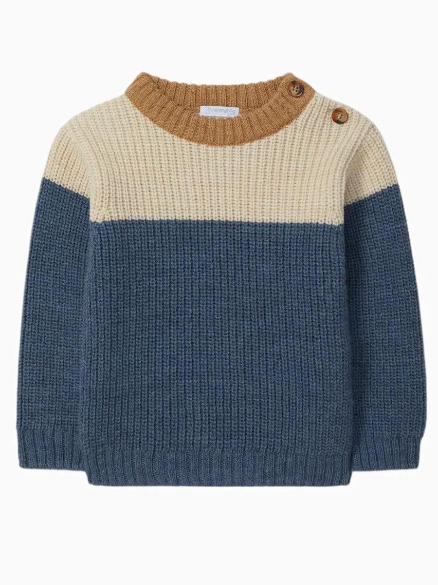 Offrez à votre enfant le plaisir d’un vêtement doux, chaud et raffiné avec ce pull en maille bleu et beige, conçu pour le suivre dans ses découvertes tout en préservant son confort et sa liberté de mouvement, saison après saison.