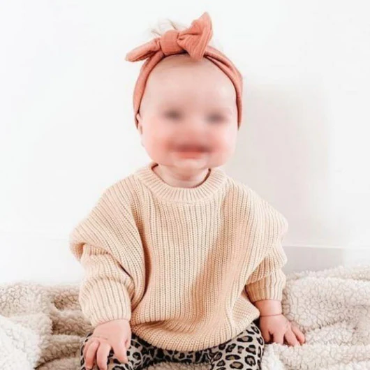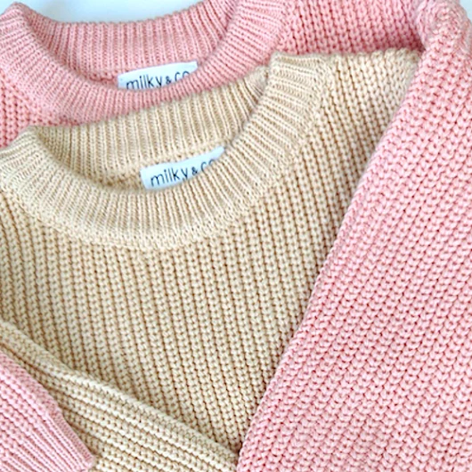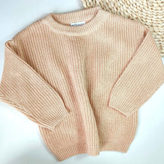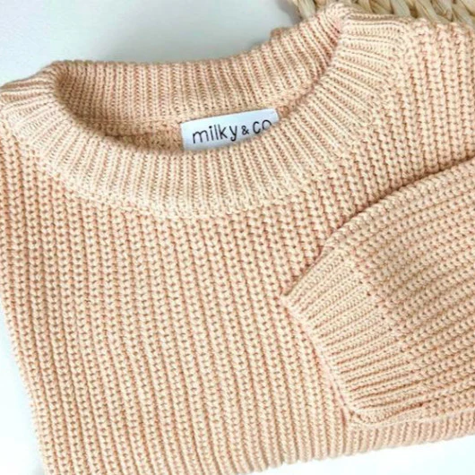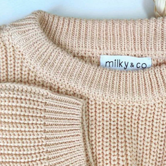 Pull maille très confortable, coloris beige. 100 % coton. Disponible du 6 mois au 3 ans. Lavable en machine 30°. Pas de sèche linge.