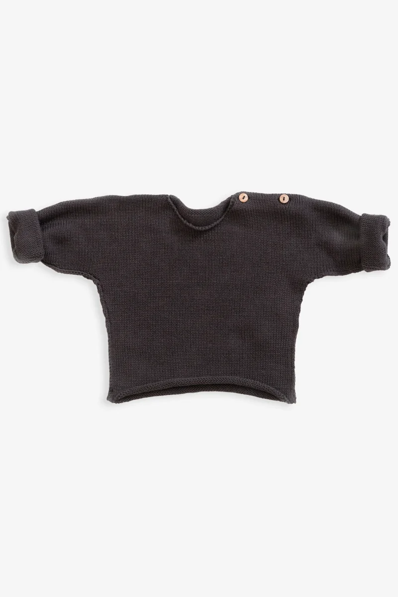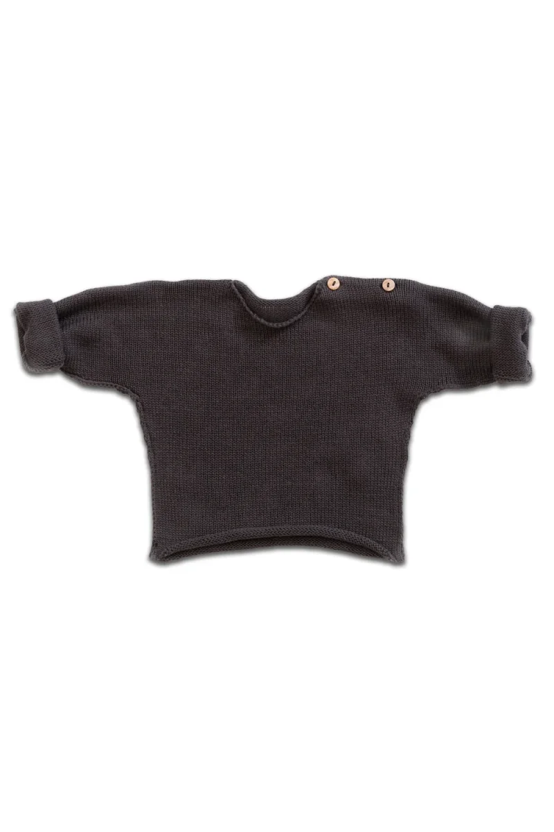 Ce pull tricoté en coton biologique est un modèle à manches longues avec une encolure ronde et une ouverture aux épaules avec deux petits boutons en bois léger.