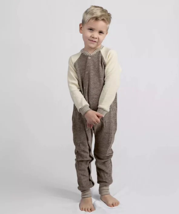 Pyjama de la marque Engel Natur, fabriqué en Allemagne. Coloris unique : écru et brun noix.