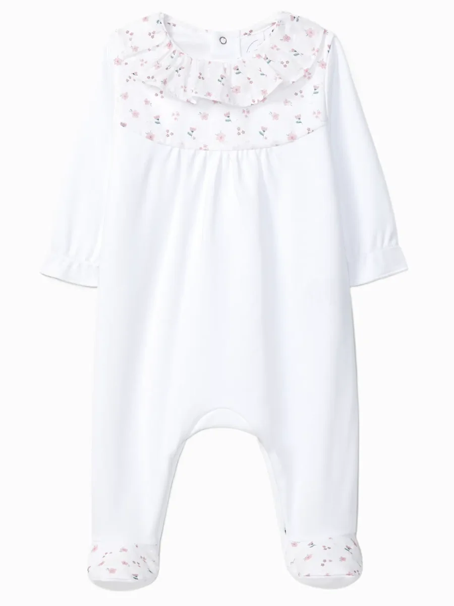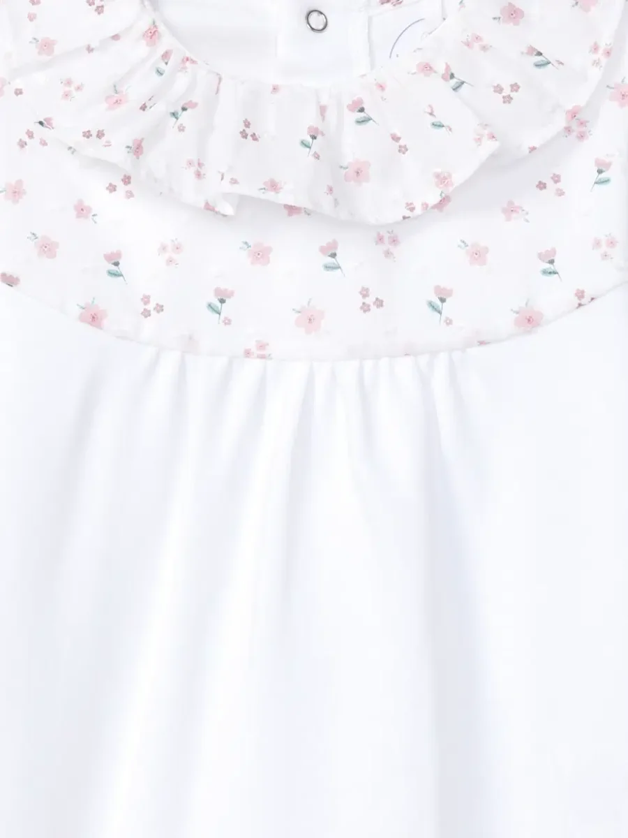 Le charme de ce pyjama bébé réside dans sa collerette volantée en tissu plumetis à imprimé floral. Les petites fleurs apportent une note poétique et subtile, parfaitement adaptée à l’univers tendre de la petite enfance.