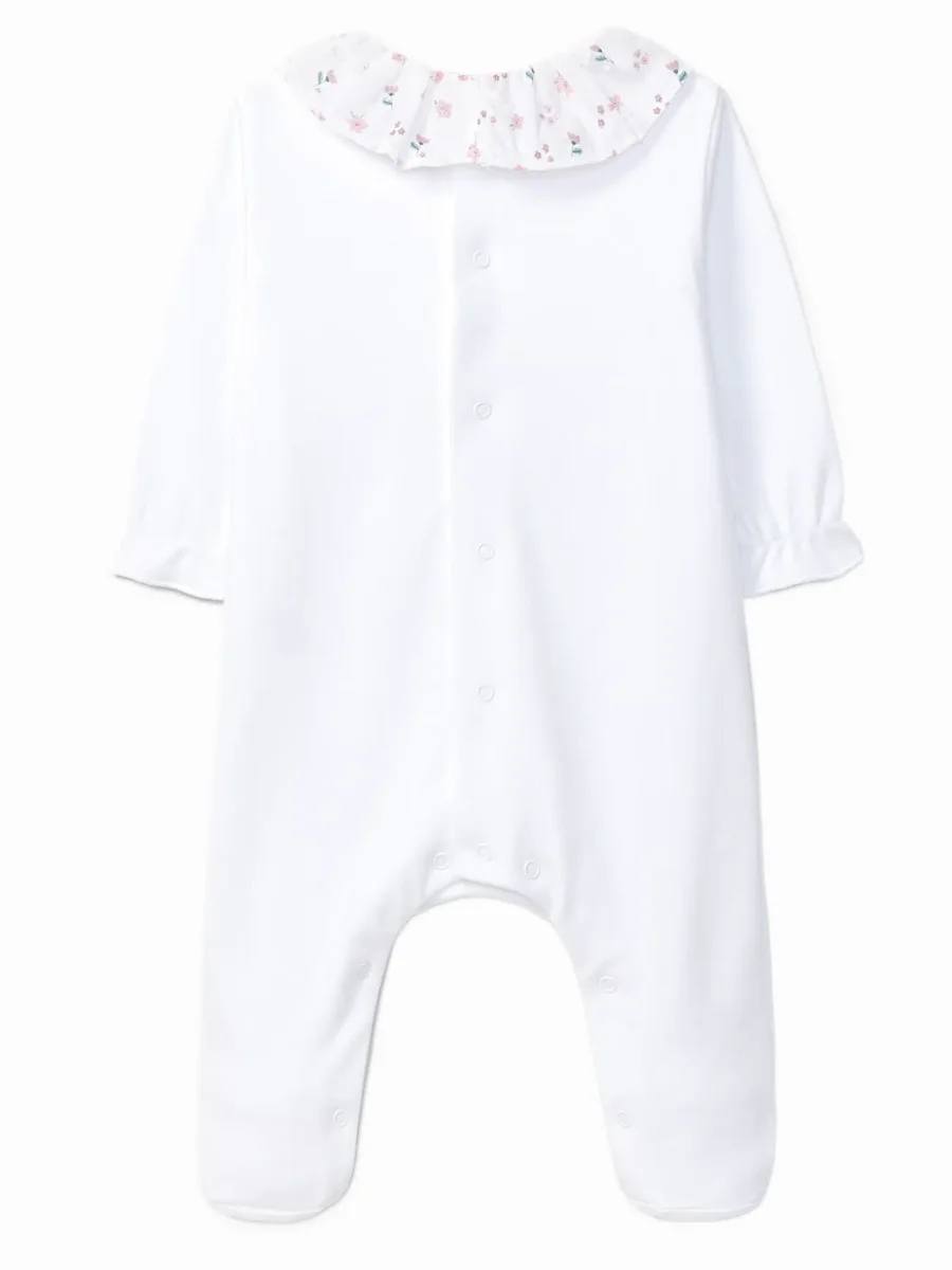 Le pyjama bébé fille blanc à collerette fleurie est une pièce incontournable pour composer un vestiaire de nuit à la fois confortable et raffiné. Élégant sans être trop habillé, il accompagne bébé dans ses premiers mois avec douceur et délicatesse.