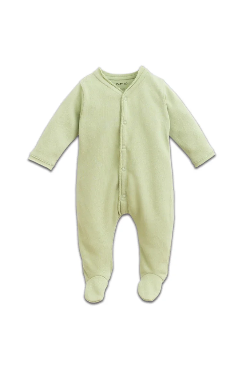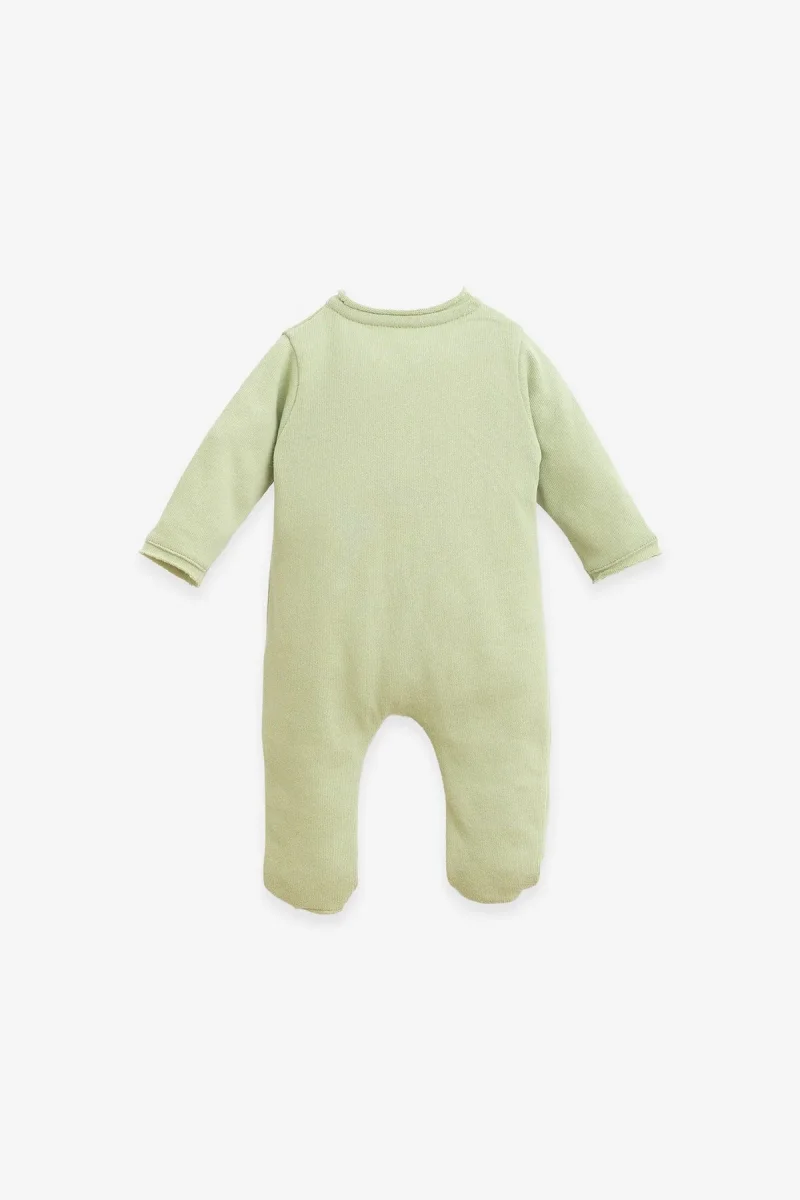 Ce pyjama de couleur vert clair est fabriqué en coton biologique à points de jersey. Ce modèle avec pieds a une encolure en V et une ouverture sur le devant.