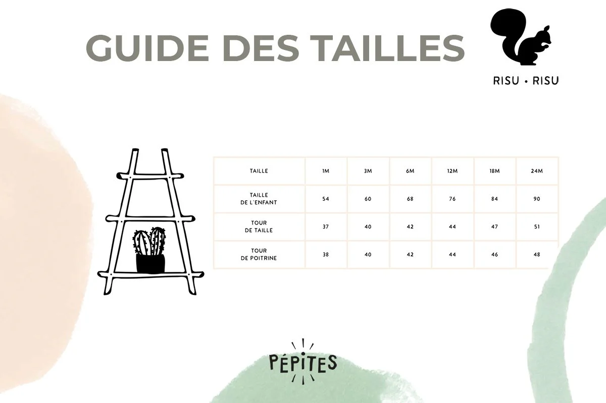 Confection : espagnole Composition : 100% jersey bio certifié GOTS Pourquoi Pépites a choisi ce vêtement ? Un brin rétro, tellement de poésie, on adore Risu Risu ! Une marque imaginée en France et produite en Espagne et en France, des imprimés subtils, des couleurs douces. Nos bébés seront apaisés et au maximum du confort […]