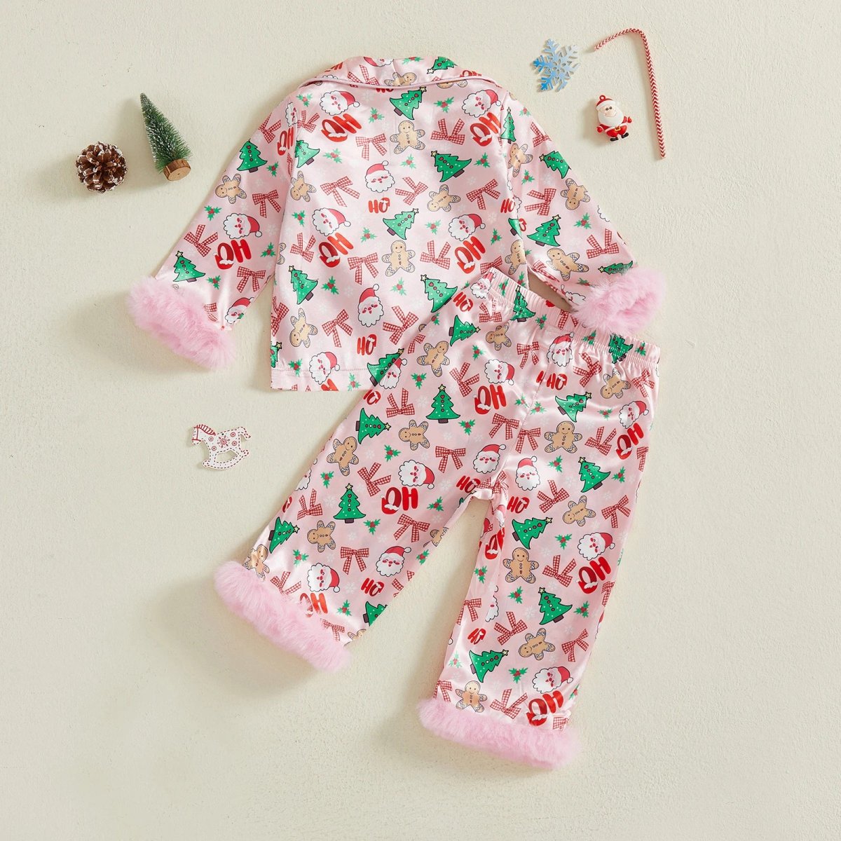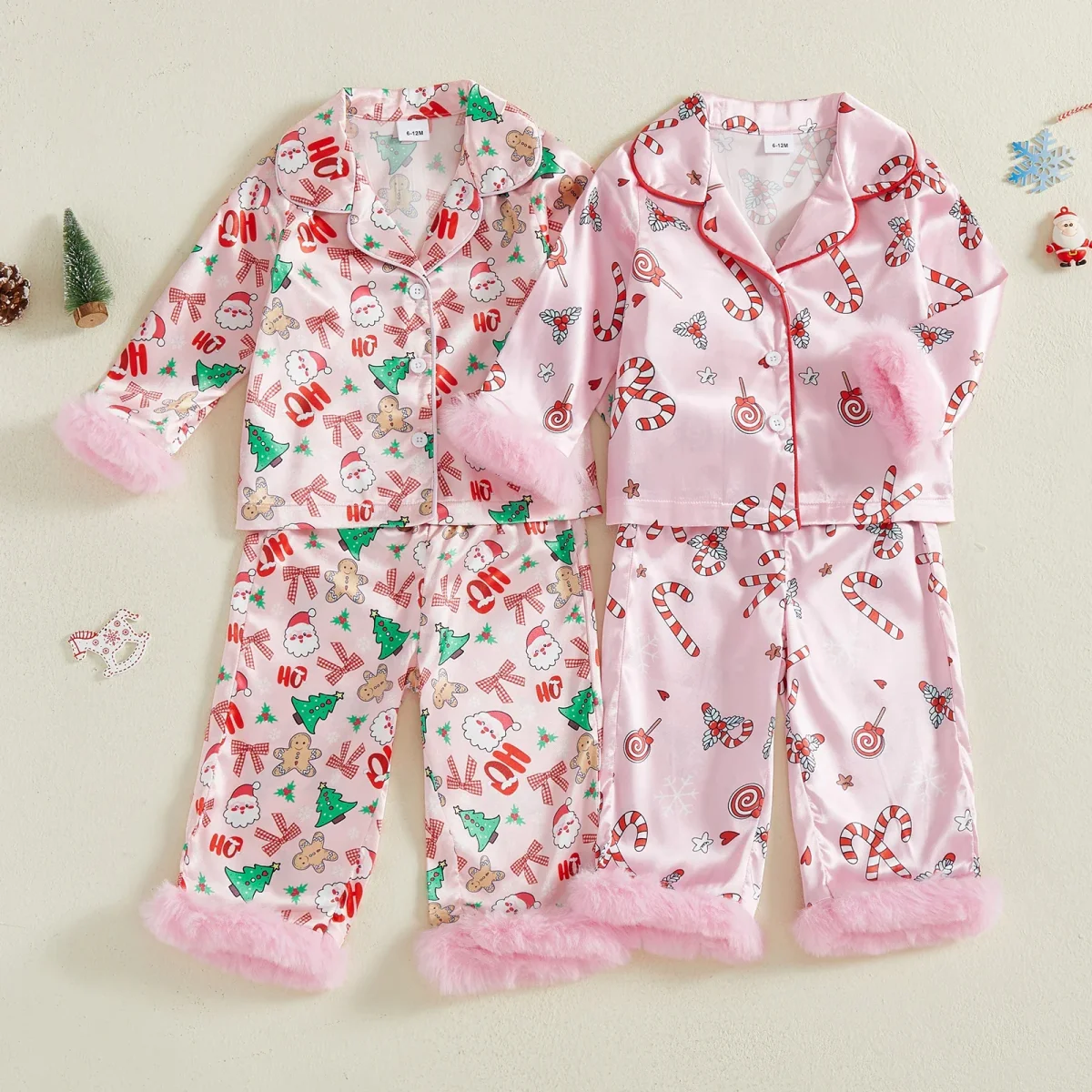 Ses motifs gourmands de bonbons, sucres d’orge et branches de houx rappellent les traditions de Noël et les moments en famille près du sapin. Les manches et ourlets bordés de fausse fourrure rose apportent une touche moelleuse et élégante, idéale pour les photos de fête et les matins du 25 décembre.