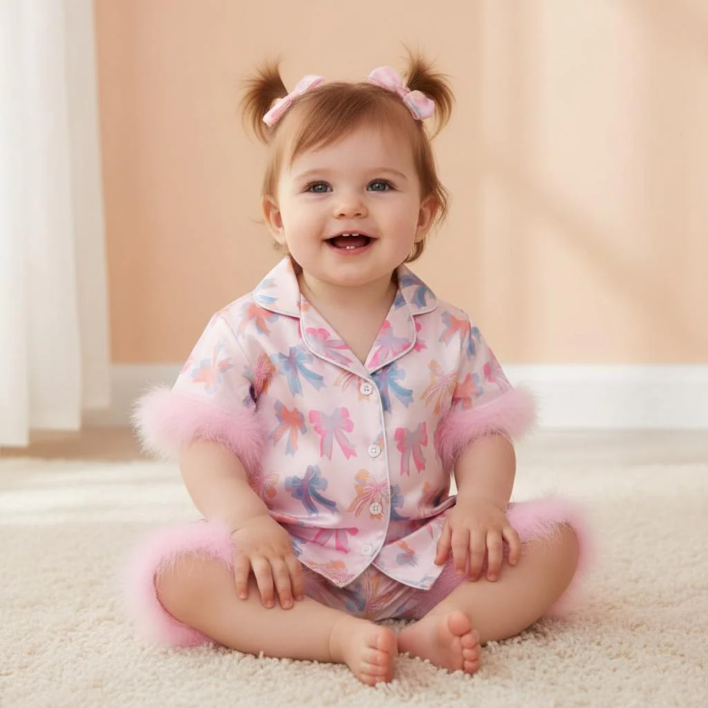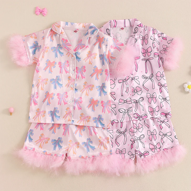 Pyjama fille avec froufrou – 2 pièces Ensemble chemise et short léger en polyester satiné, décoré de jolis nœuds colorés.Finitions en froufrou roses aux manches et au bas du short pour une touche girly et élégante. Parfait pour les soirées pyjama et les nuits tout en douceur !