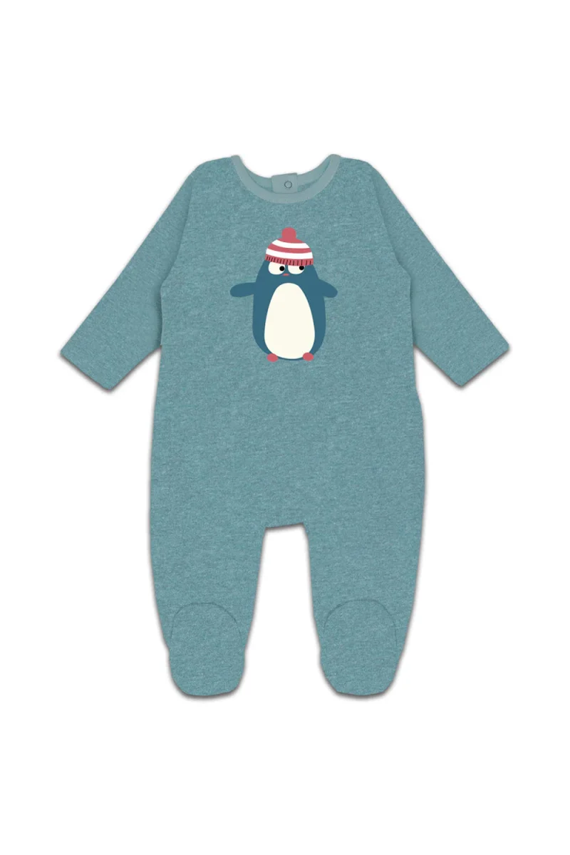 Grenouillère bleu chiné en coton 100 % BIO certifié GOTS. Pont arrière à pression pour un habillage facile.