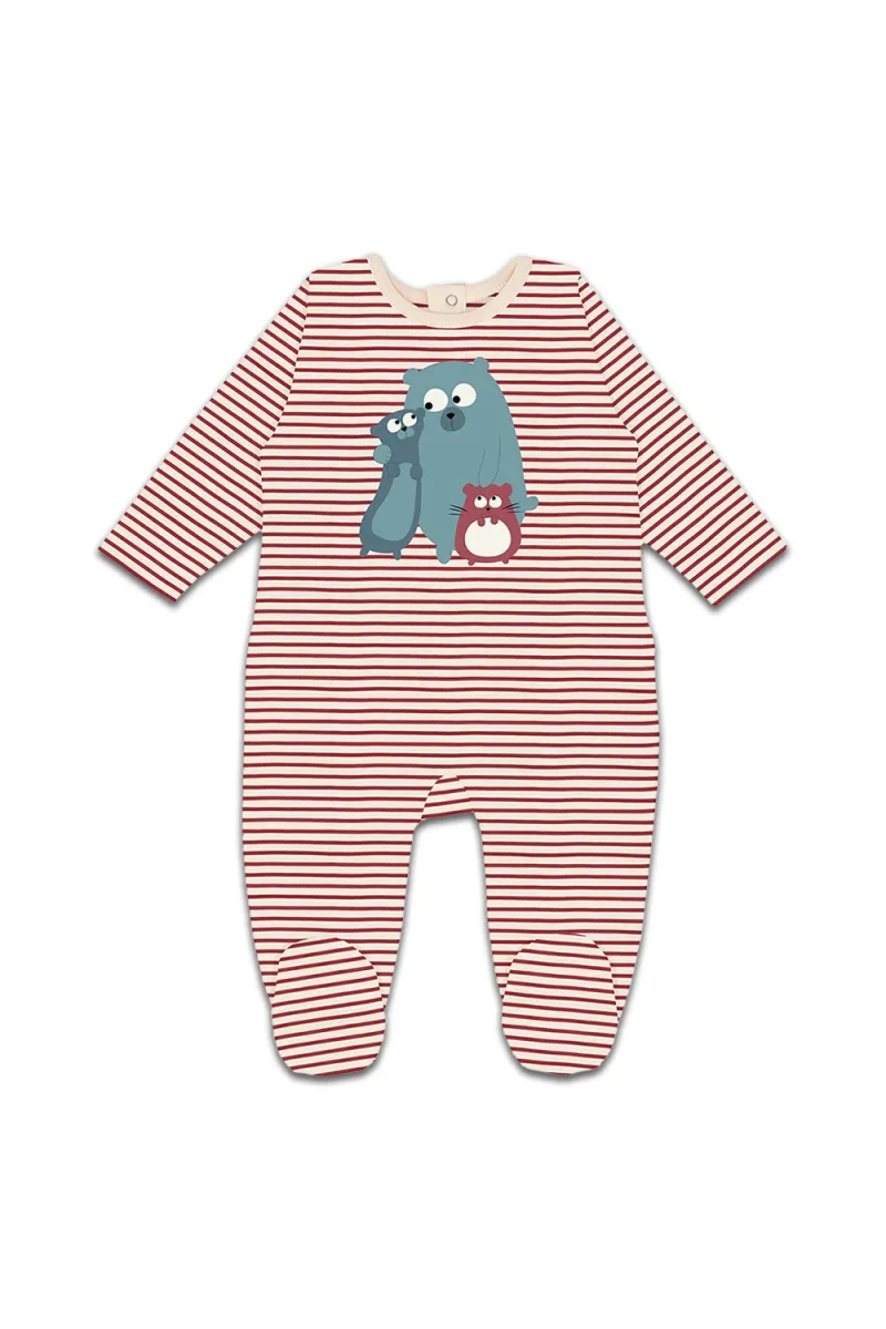 Grenouillère 100% coton BIO certifié GOTS avec ses fines rayures crème et grenat. Pont arrière à pression pour un habillage facile.