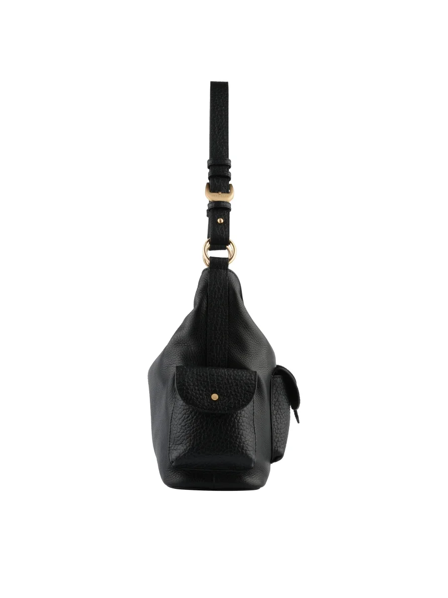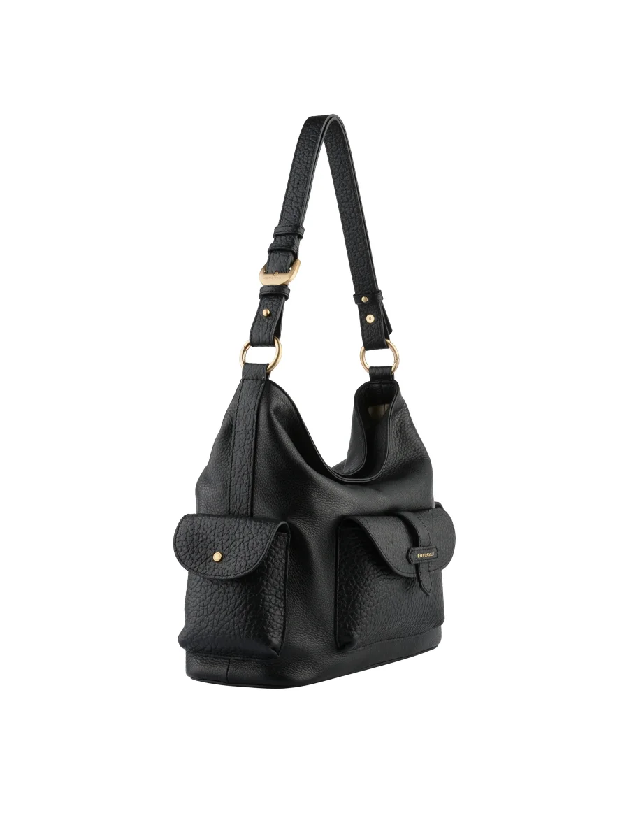 Son design se distingue par ses poches extérieures à rabat, signature fonctionnelle et esthétique de la ligne, offrant un accès rapide aux essentiels tout en affirmant son caractère. Décliné en deux portés — main ou épaule selon le modèle