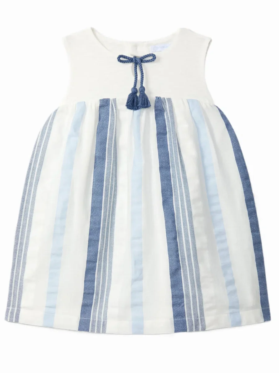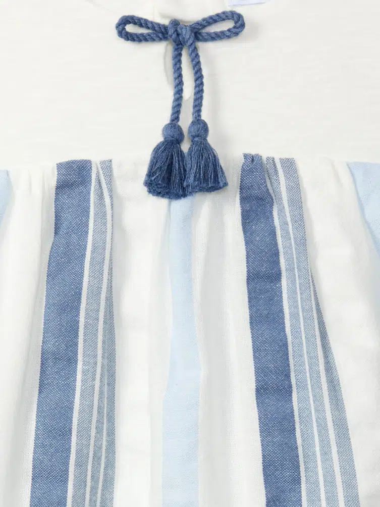 Cette robe à rayures blanc et bleu s’intègre facilement dans le vestiaire de l’enfant. Elle peut être portée seule ou associée à des accessoires simples pour compléter la tenue.
