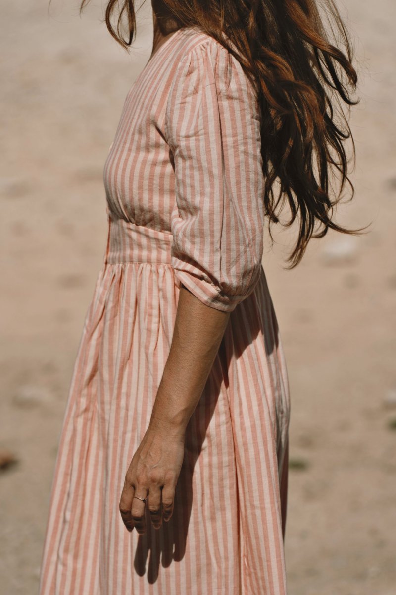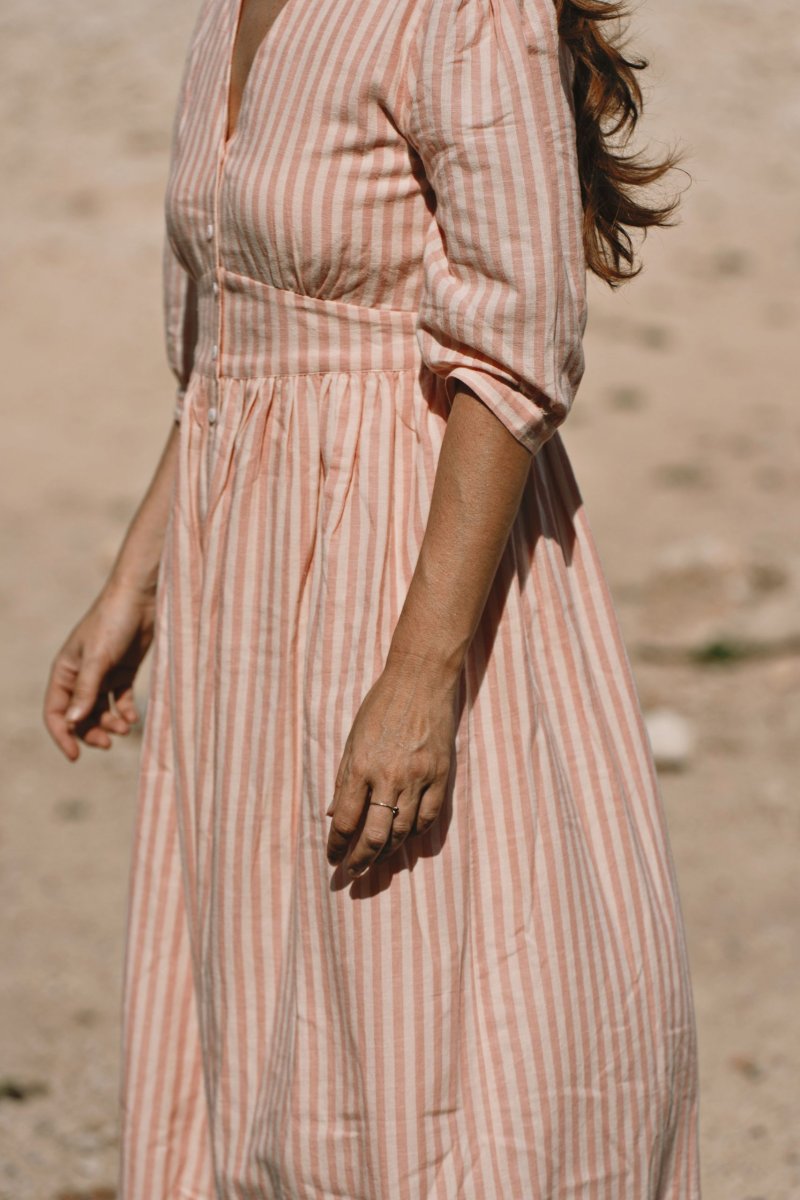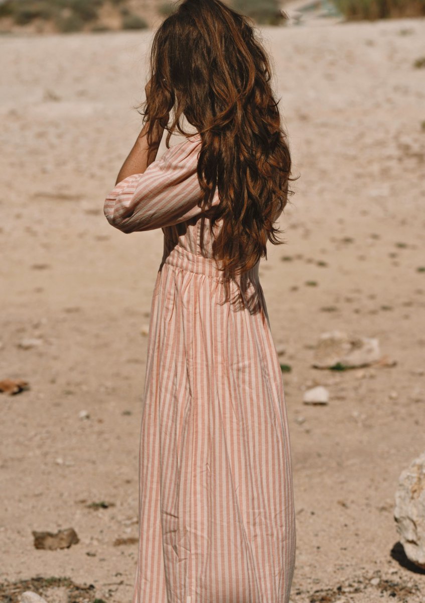 La robe Appoline Rayée Rose séduit par son allure fraîche et lumineuse. Son motif rayé rose apporte une touche délicate et intemporelle, parfaite pour la saison estivale.