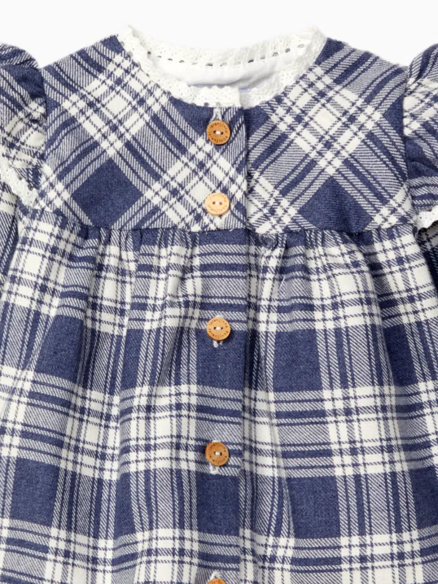 L’encolure ronde raffiné en dentelle et les volants aux épaules apportent une touche d’élégance intemporelle à notre robe. Les carreaux bleu et blanc évoquent la douceur des souvenirs d’enfance, les goûters improvisés et les promenades dans le jardin. La fermeture par de jolis boutons en bois sur le devant facilite l’habillage au quotidien tout en ajoutant un détail authentique.