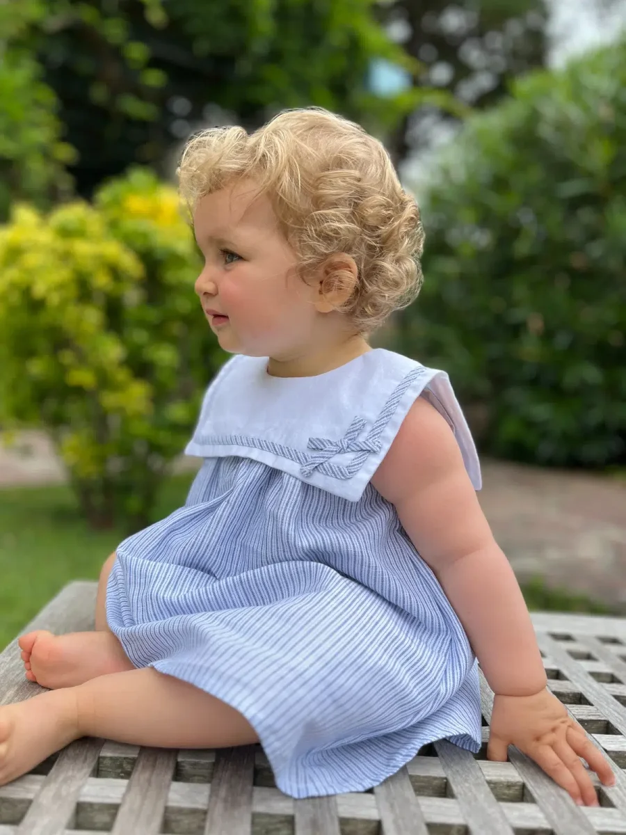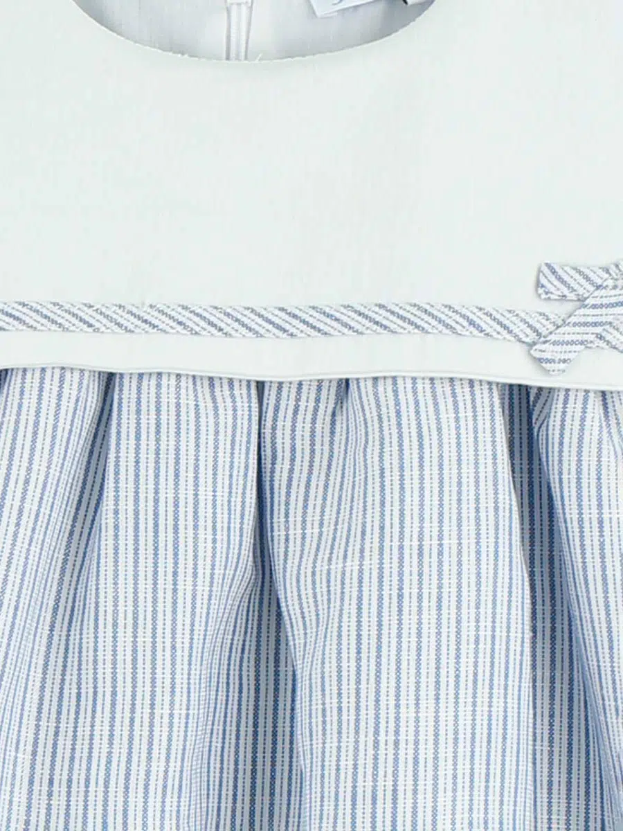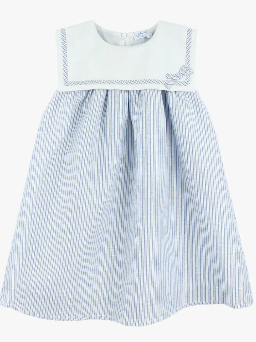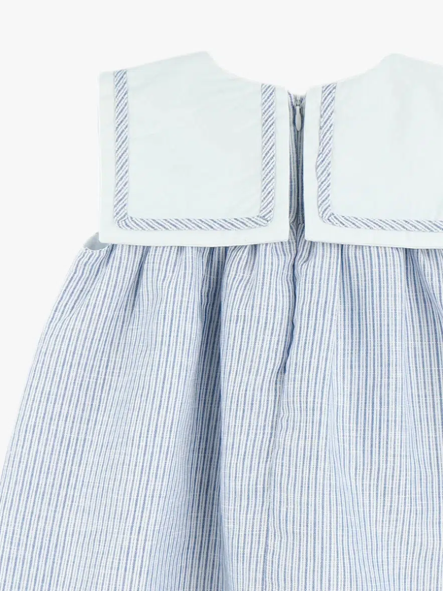 Ses rayures bleues et blanches, classiques et indémodables, évoquent la fraîcheur des journées en bord de mer, ajoutant une touche de charme nautique à la garde-robe de votre enfant. Le grand col délicatement travaillé, à la fois chic et rétro, sublime l’ensemble et confère une allure sophistiquée et féminine.