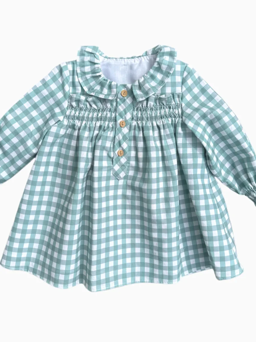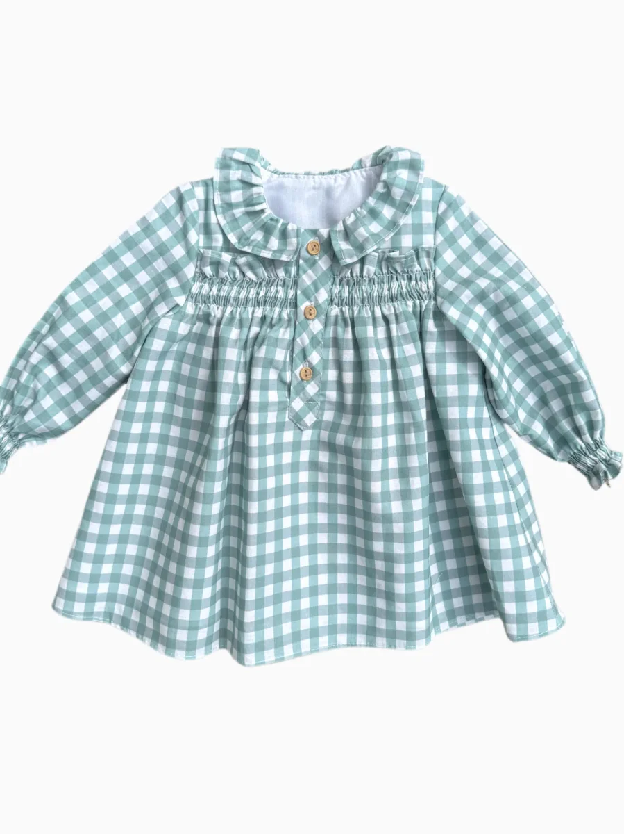Avec son motif vichy vert et blanc, cette robe bébé fille allie fraîcheur et authenticité. Son col volanté apporte une note romantique et délicate, parfaite pour mettre en valeur le visage de votre enfant. Les manches longues offrent chaleur et confort, tandis que la fermeture par trois boutons sur le devant rend l’habillage à la fois pratique et élégant.