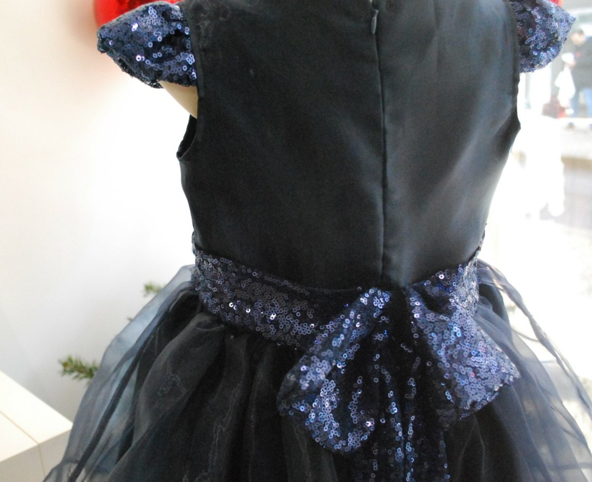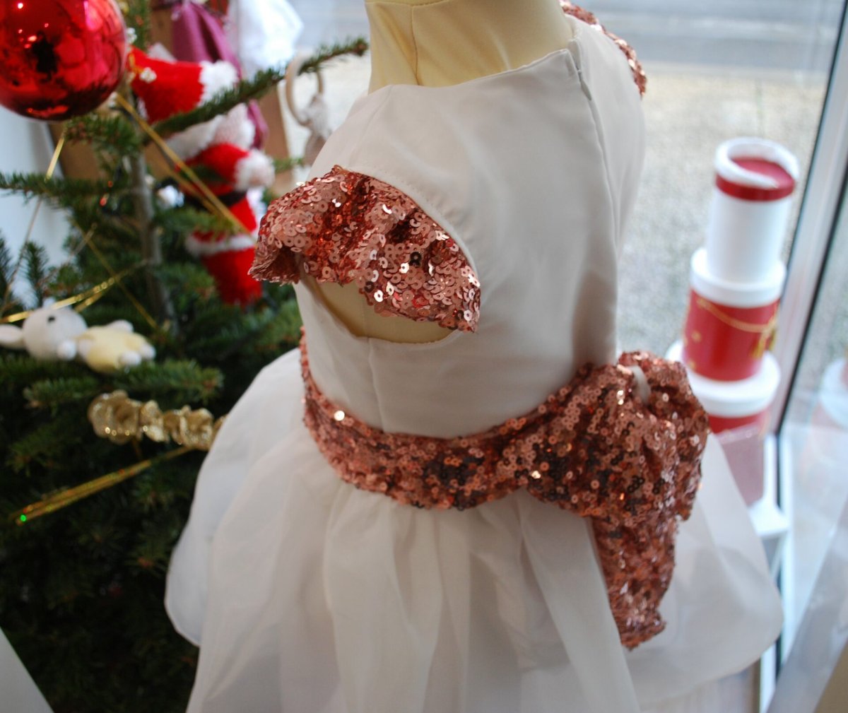Au dos une fermeture et un noeud en sequins , ce qui fini cette jolie robe de fête pour enfants. La robe est doublée en coton