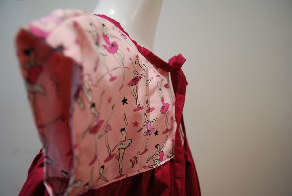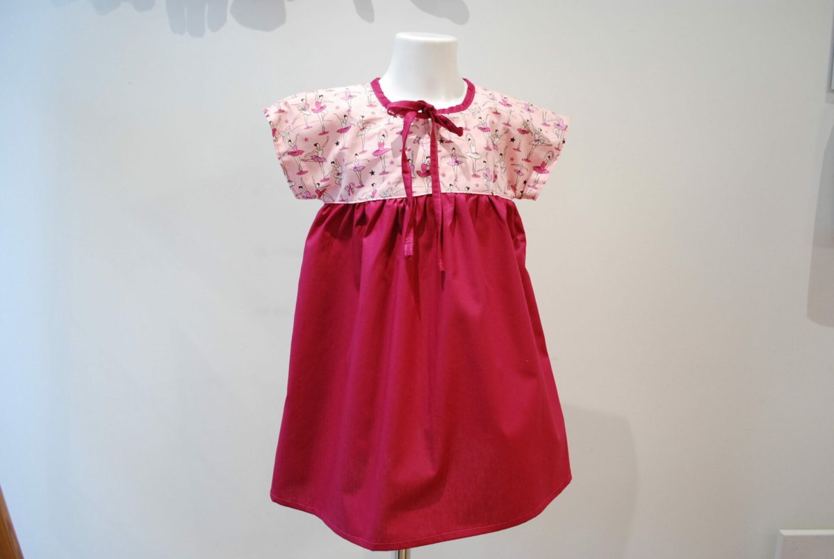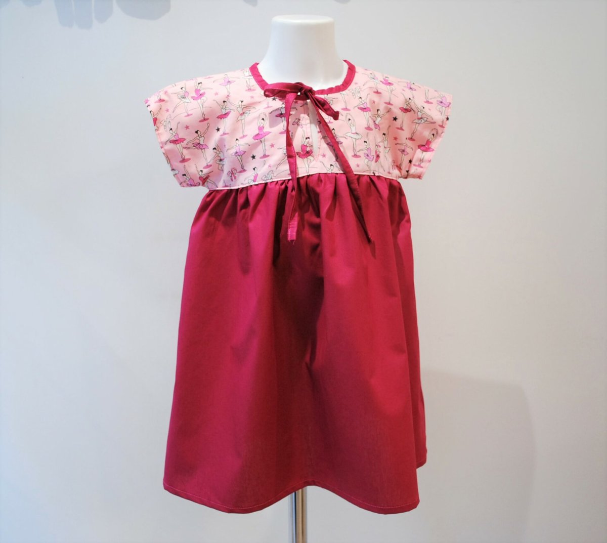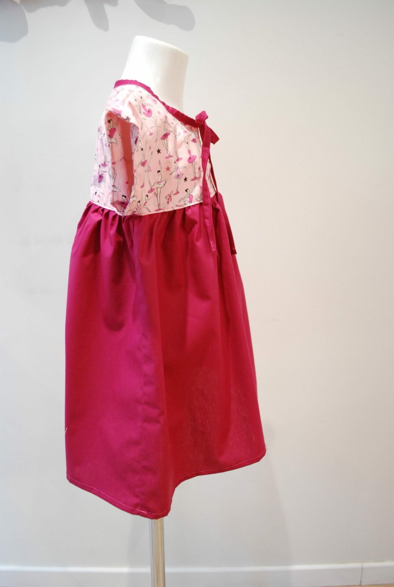 Robe avec demi-manche “DANCER” : Cette jolie robe avec manche et une belle couleur fuschia et un imprimé danseuse raviront ses petites princesses. Elle est légère, idéale pour le printemps et l’été. Elle est fermée devant par un noeud.