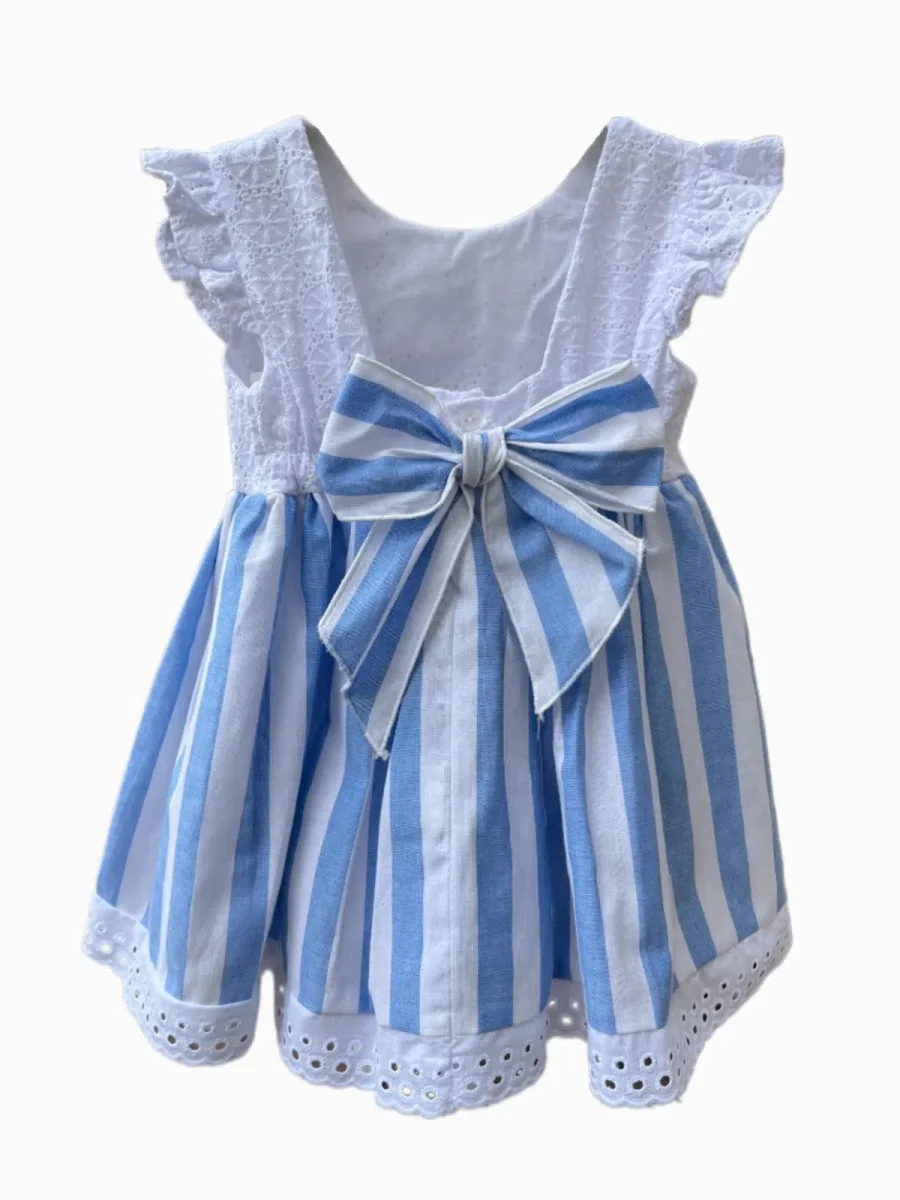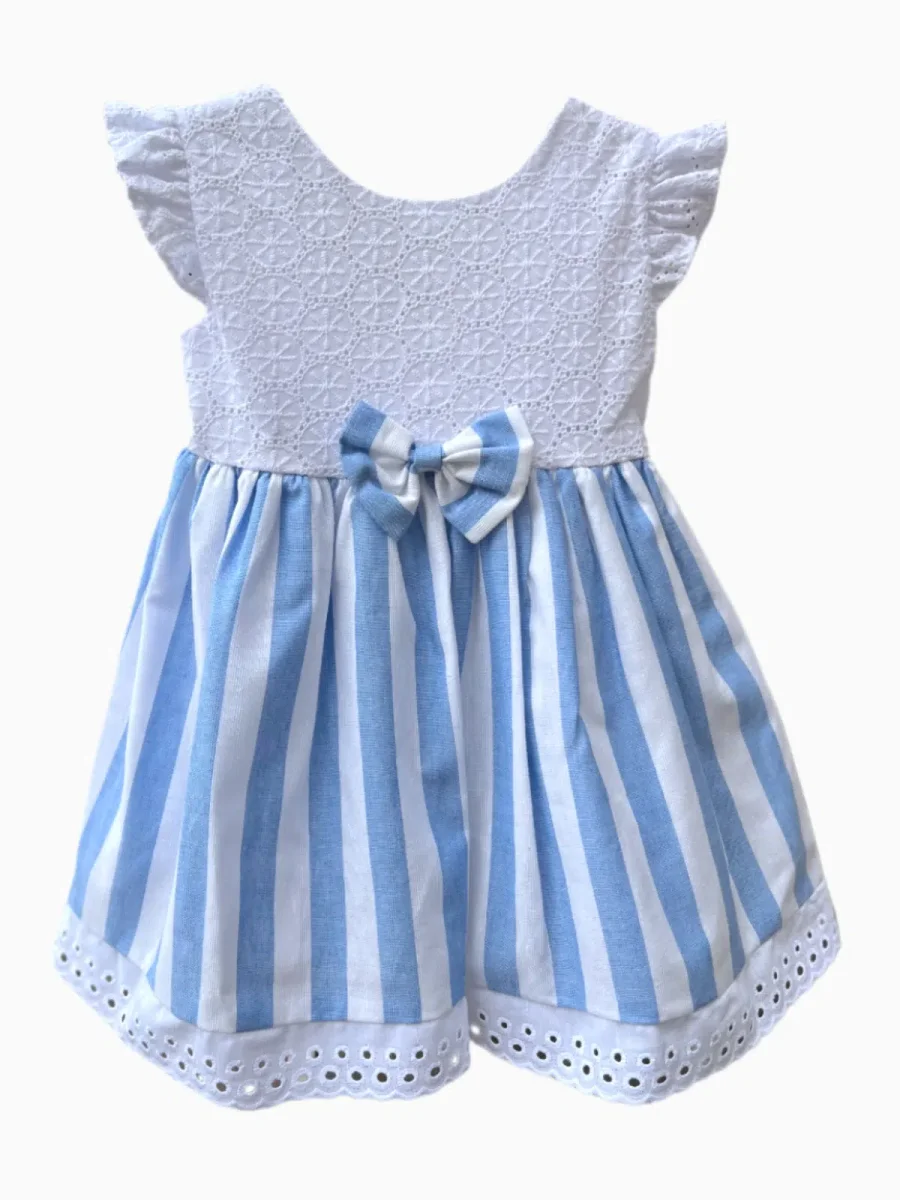 Cette robe rayée blanc et bleu ciel est parfaite pour les cérémonies, baptêmes, anniversaires ou toute autre occasion spéciale. Son mélange de textures et de détails raffinés en fait une pièce unique qui habille les petites filles avec élégance et confort.