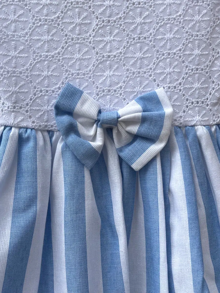 Le devant de la robe est réalisé dans un tissu brodé blanc raffiné, sublimé par un nœud délicat, apportant une touche de sophistication supplémentaire. La jupe évasée, rayée en bleu ciel et blanc, confère à cette pièce un charme estival irrésistible. La bordure en tissu brodé blanc, assortie au haut de la robe, apporte une finition élégante et soignée.