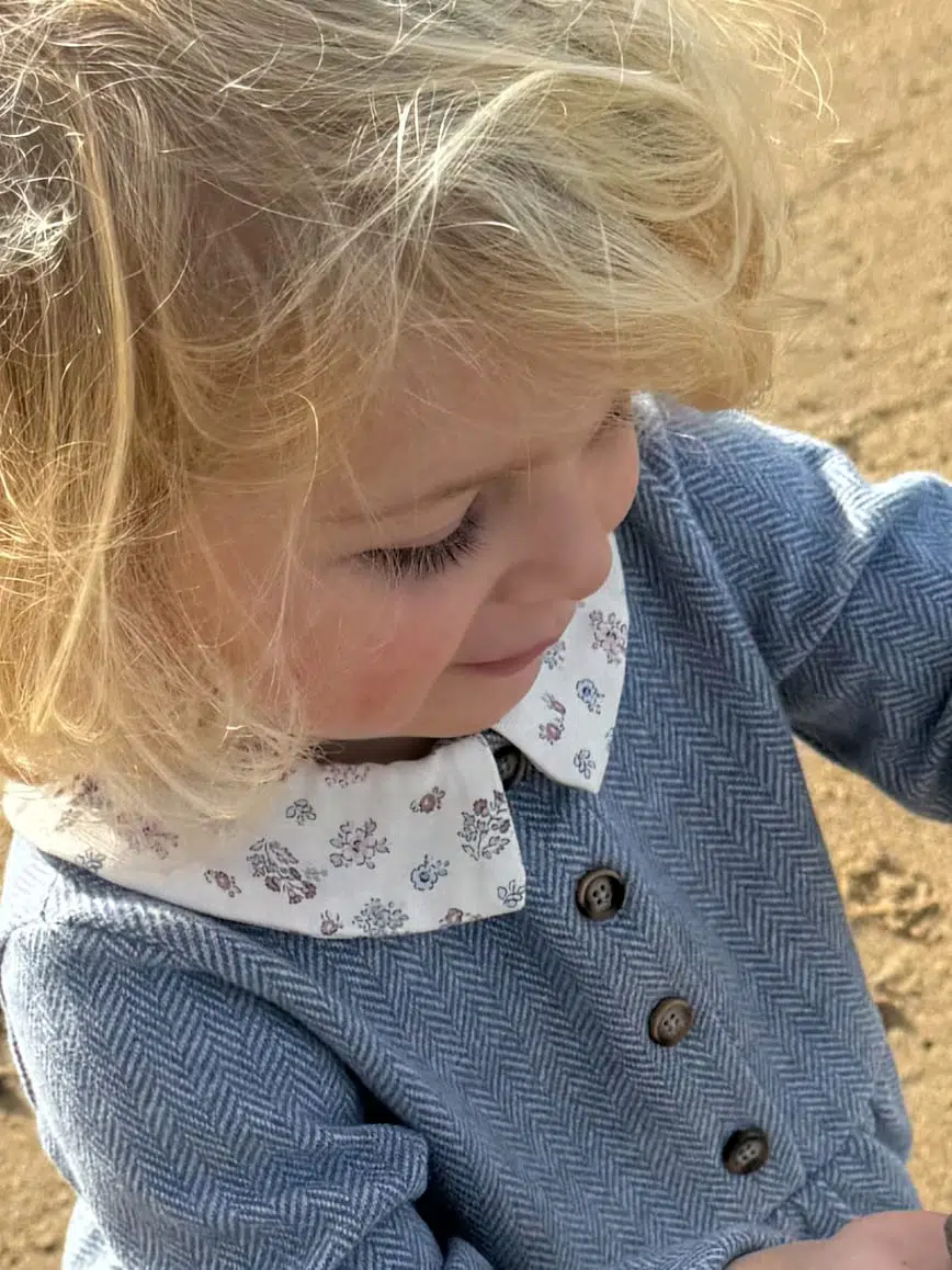 Le col est orné d’un tissu imprimé à fleurs dans des tons doux, apportant une touche poétique et enfantine à la robe, dans l’esprit raffiné de Voyage de la Baleine. Ce tissu fleuri se retrouve également sur le bord des poches, créant un rappel discret qui enrichit la silhouette avec délicatesse.