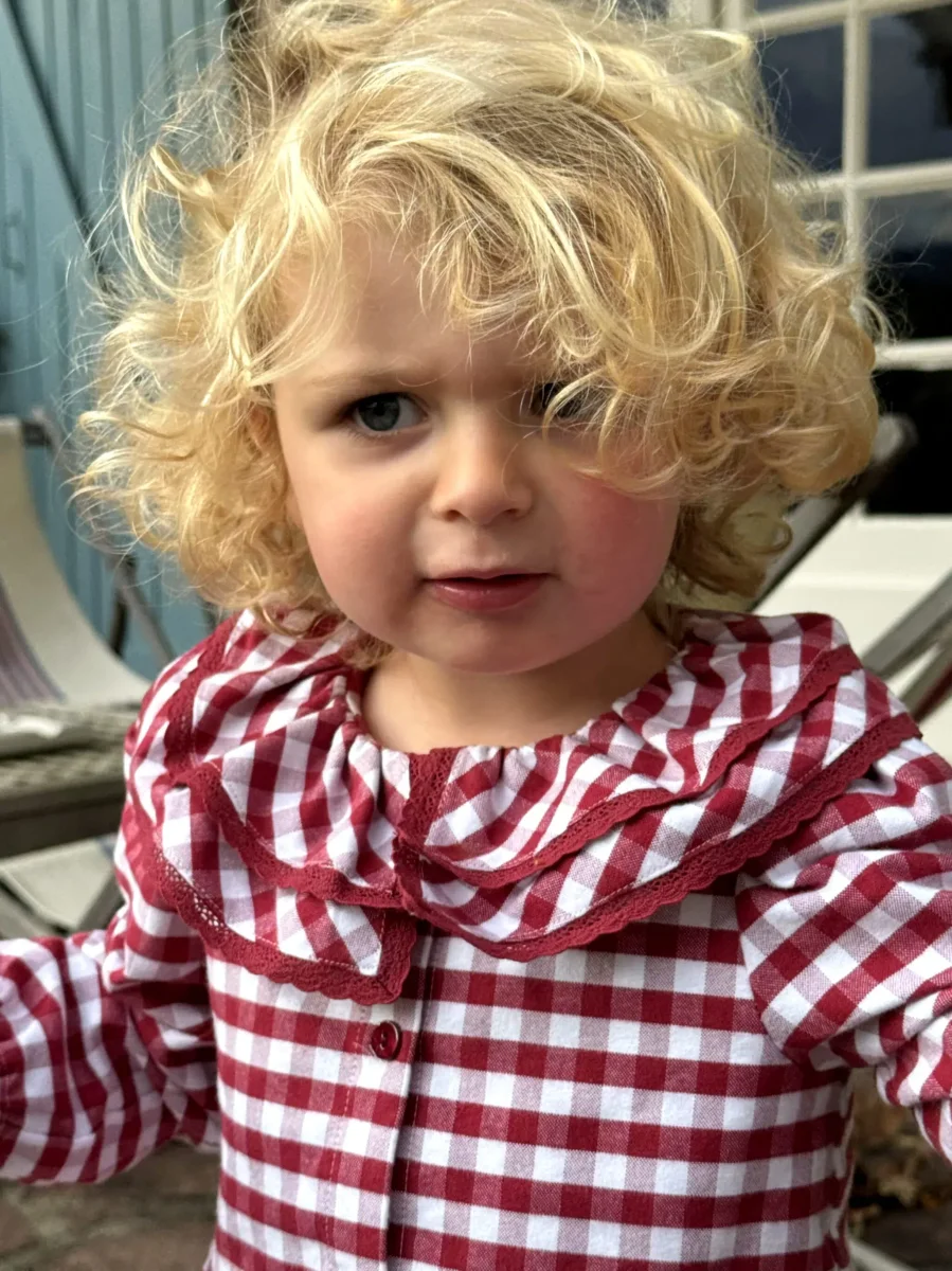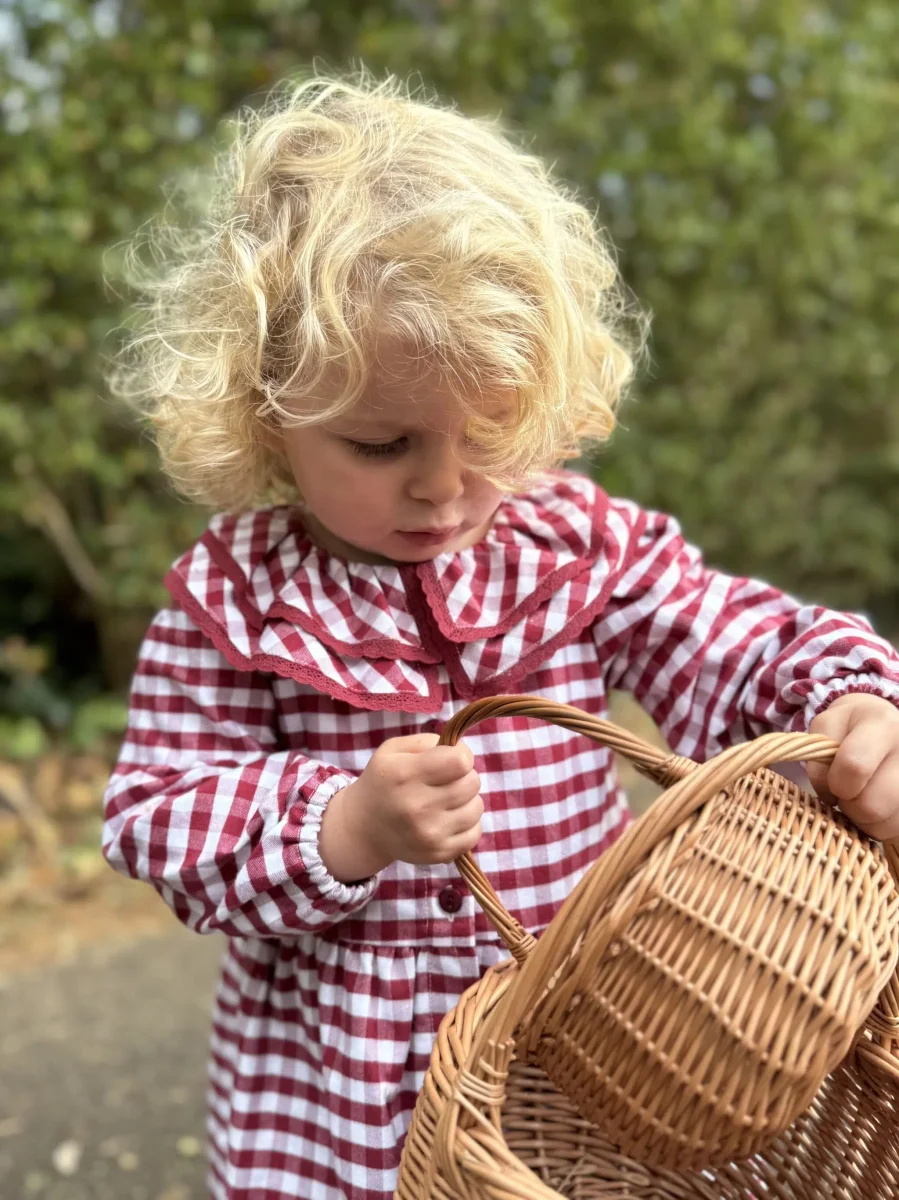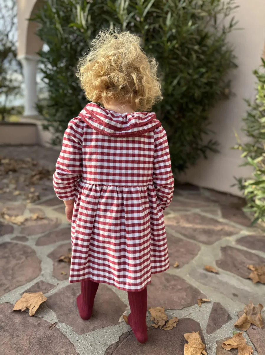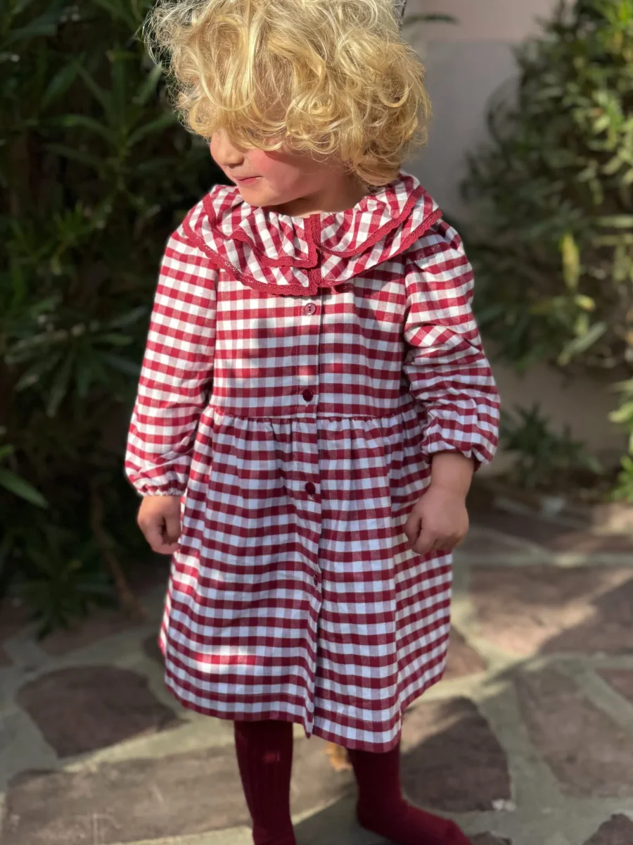 L’ouverture à boutons sur le devant facilite l’habillage tout en ajoutant un détail élégant qui fait toute la différence. Cette robe se distingue par son mélange de style classique et de confort moderne, offrant à votre petite fille une allure soignée sans sacrifier sa liberté de mouvement. Le vichy bordeaux donne à la robe un charme particulier, évoquant la douceur et l’élégance des tenues d’autrefois tout en restant résolument actuelle.