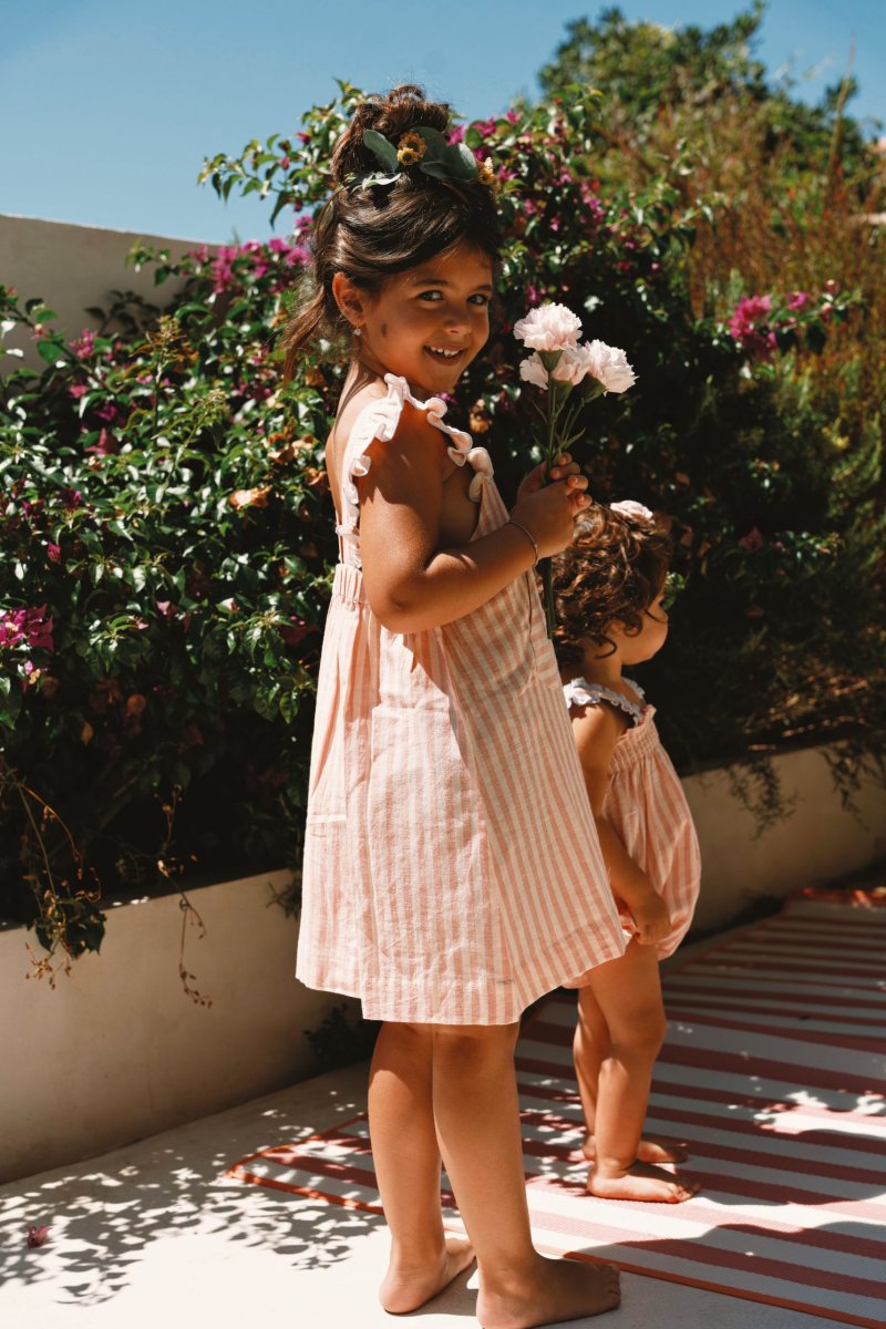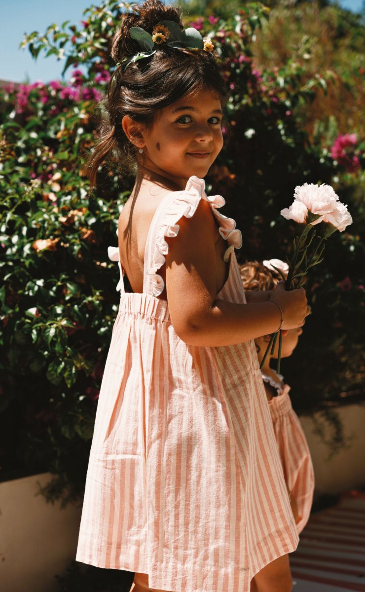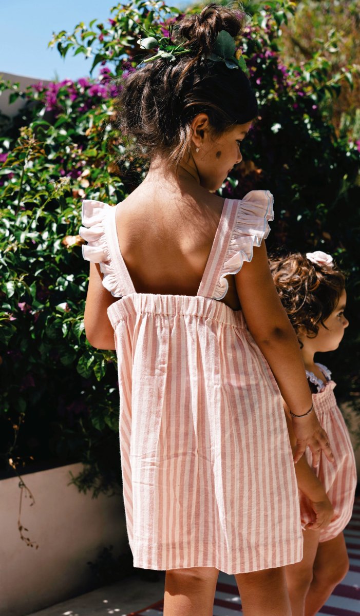 La robe Ève pour enfant, en 100% coton, séduit par ses rayures roses tendres et lumineuses. Ses bretelles à volants apportent une touche légère et poétique, tandis que sa coupe confortable permet une grande liberté de mouvement. À l’avant, une poche plaquée ornée d’une délicate broderie ajoute un détail plein de charme. Une robe douce et pratique, idéale pour accompagner les journées ensoleillées des enfants.