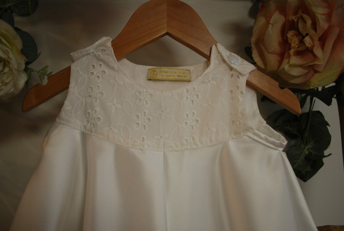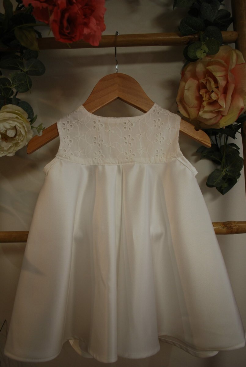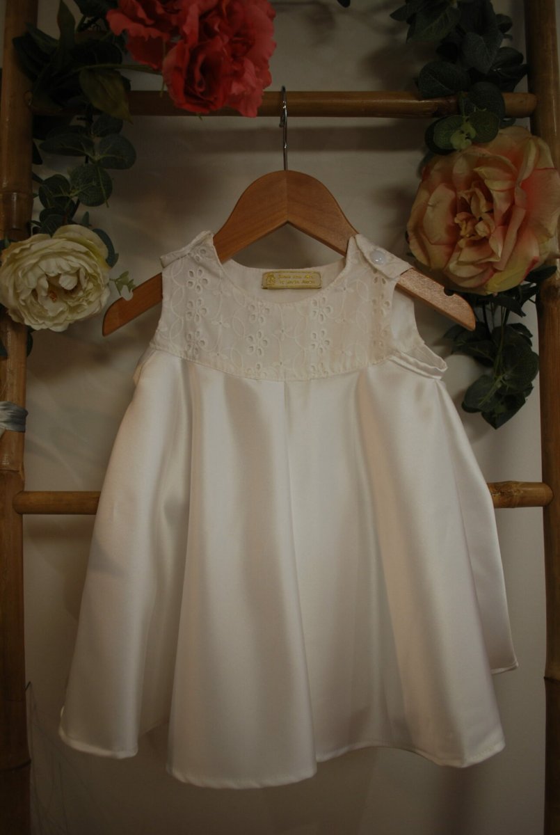 Robe fillette pour cérémonie SYLVIA : Une robe fillette pour une cérémonie de baptème ou de mariage. Ses petites Princesses pourront faire tourner leur robe grâce à la fluidité du satin et sa forme évasée. Le haut de la robe fillette est en coton brodé. Elle s’attache avec un bouton sur chaque épaule pour plus de faciliter d’habillage.