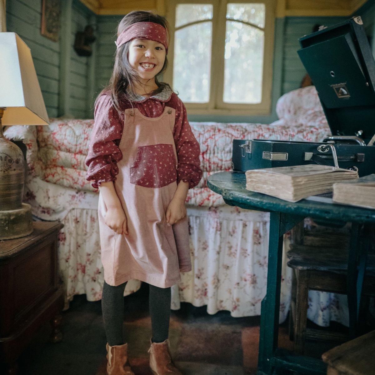 Jolie robe / salopette enfant en velours, 100% coton, bretelles ajustables, poche petite fleur sur le devant