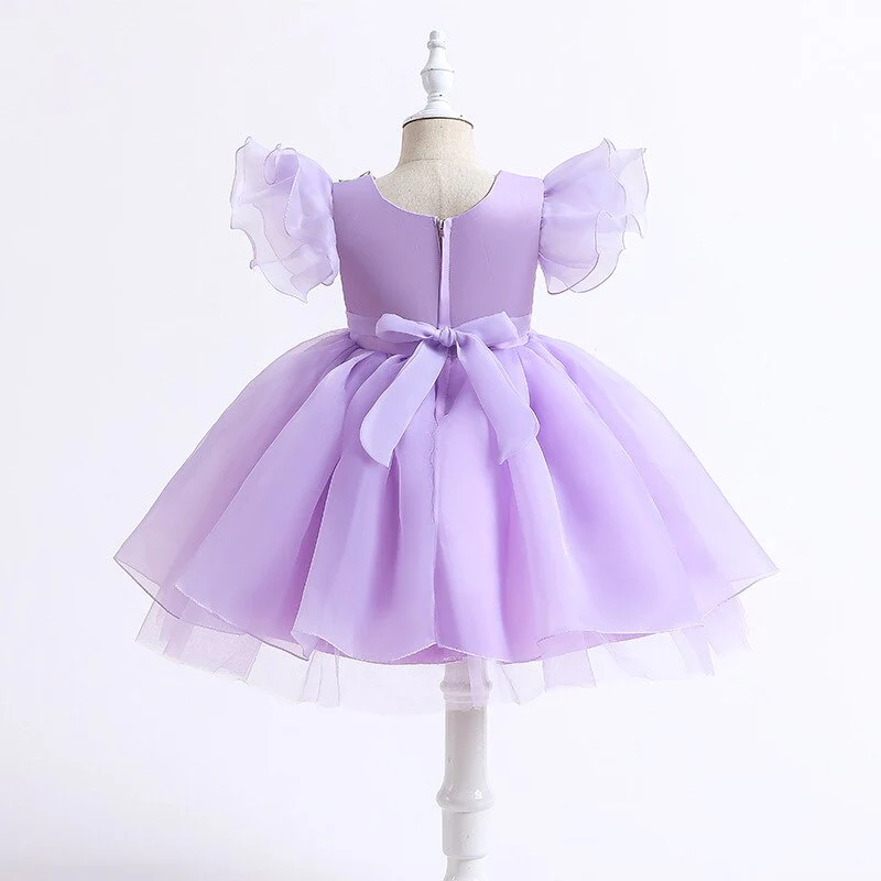 Ce magnifique modèle de robe avec des petits paillons intégrés dessus. Parfaite robe pour se sentir comme une princesse dans un conte de fée. Des petites manchettes délicates en volant. Un nœud à l’avant de la robe avec deux petits rubans. Une fermeture au dos de la robe. Ajuster la robe avec la ceinture en faisant un nœud au dos.