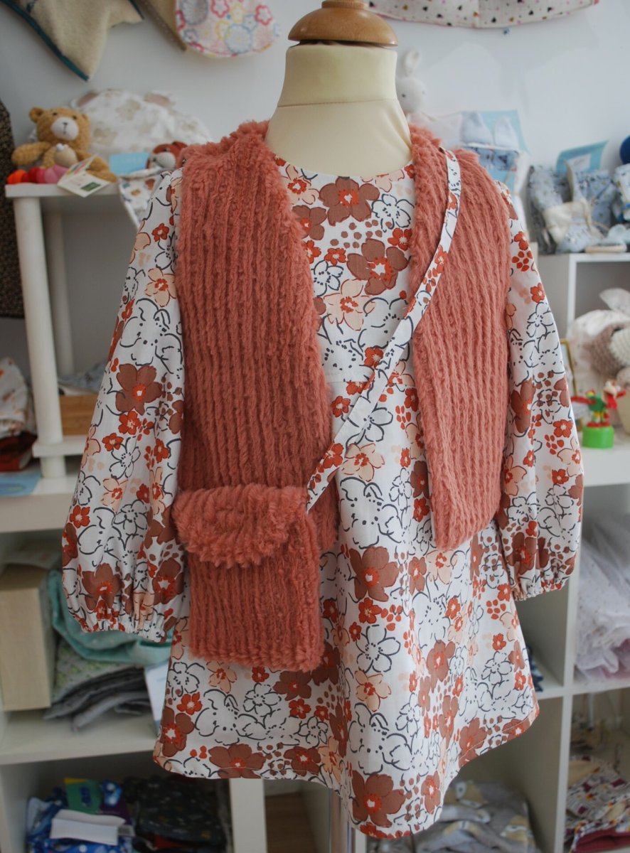 Robe : Jolie robe en coton doublée avec son gilet en fausse fourrure assorti et son petit sac en bandoulière. L’ensemble qui reste en stock est soldé Cette robe très agréable à porter, un imprimé automnal. Les manches sont bouffantes et élastiquées au poignet pour le confort . Le gilet peut se mettre avec la […]