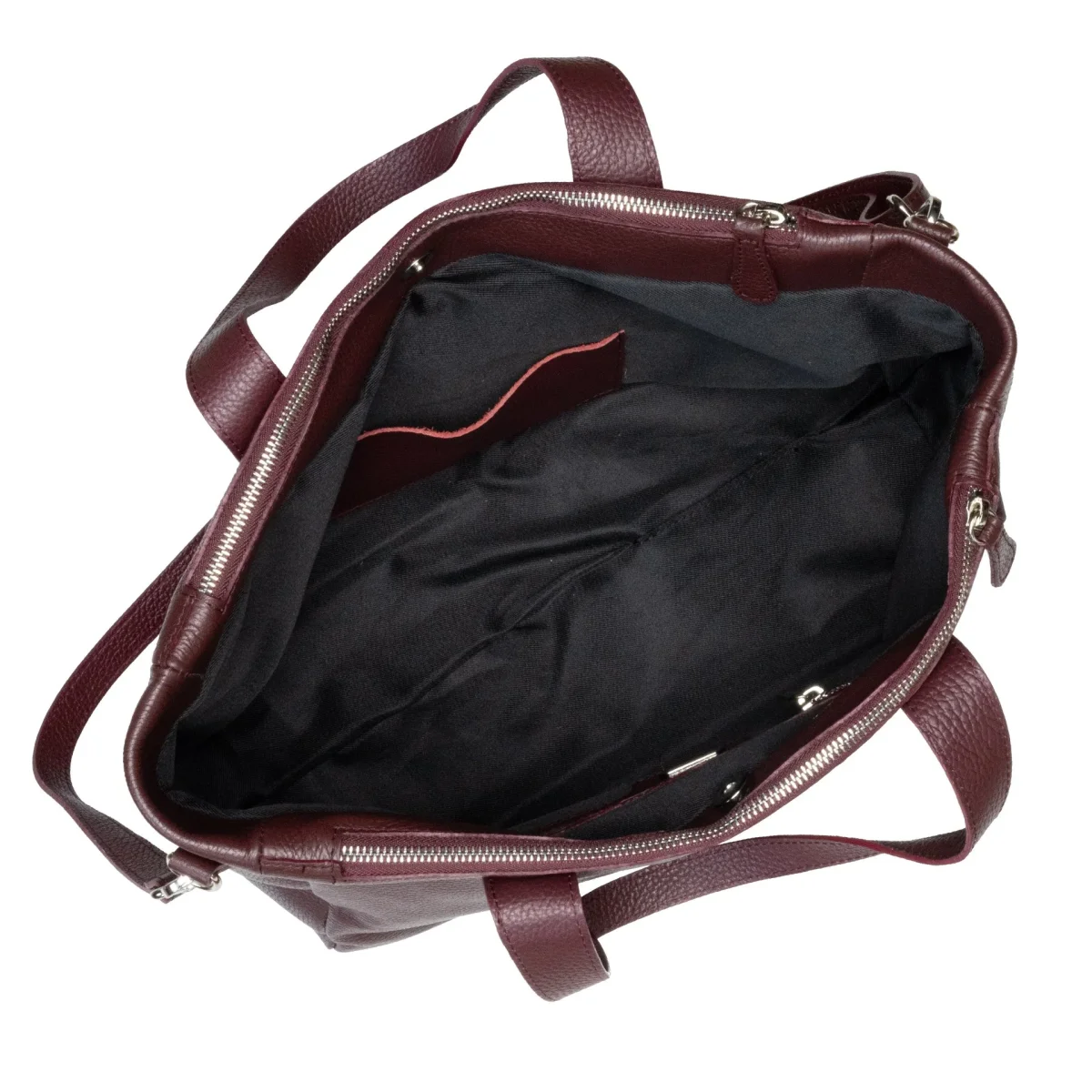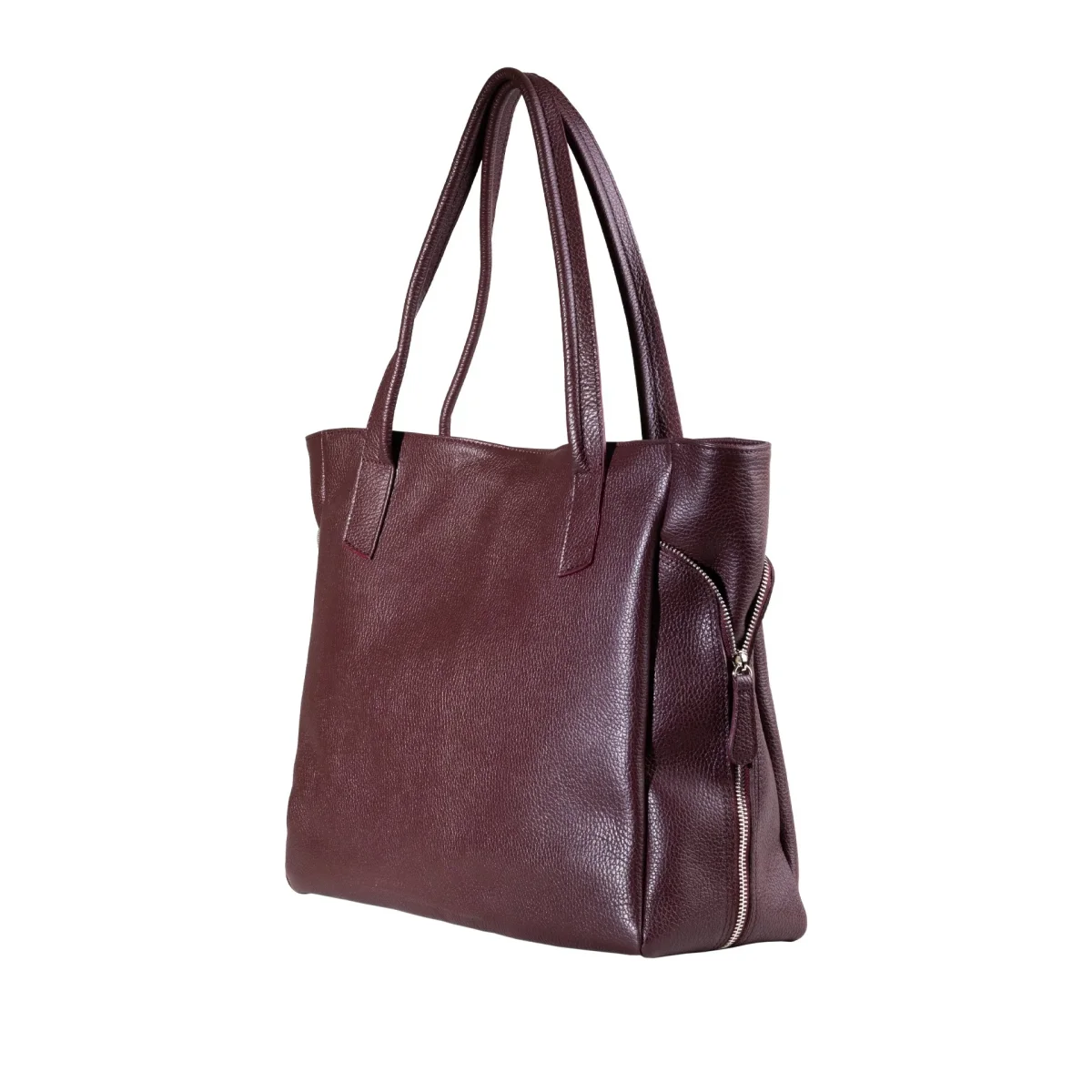 Ce sac cabas en cuir grainé bordeaux séduit par sa sobriété chic et sa grande capacité. Ses longues anses permettent un porté épaule confortable, tandis que sa forme souple et structurée offre un bel espace de rangement. Le compartiment principal zippé est agrémenté de poches intérieures pratiques. Deux zips latéraux ajoutent une touche d’originalité tout en offrant une ouverture élargie. Un sac à la fois fonctionnel et raffiné, idéal pour le bureau ou les journées chargées.