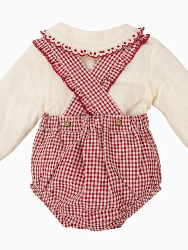 La salopette bébé vichy rouge est croisée dans le dos, un détail qui ajoute une dimension de sophistication et assure un ajustement parfait. Les bretelles croisées sont non seulement esthétiques mais aussi pratiques, offrant un maintien optimal tout en permettant une grande liberté de mouvement. Les adorables froufrous au niveau des bretelles apportent une touche féminine et espiègle, rendant cette salopette encore plus irrésistible.