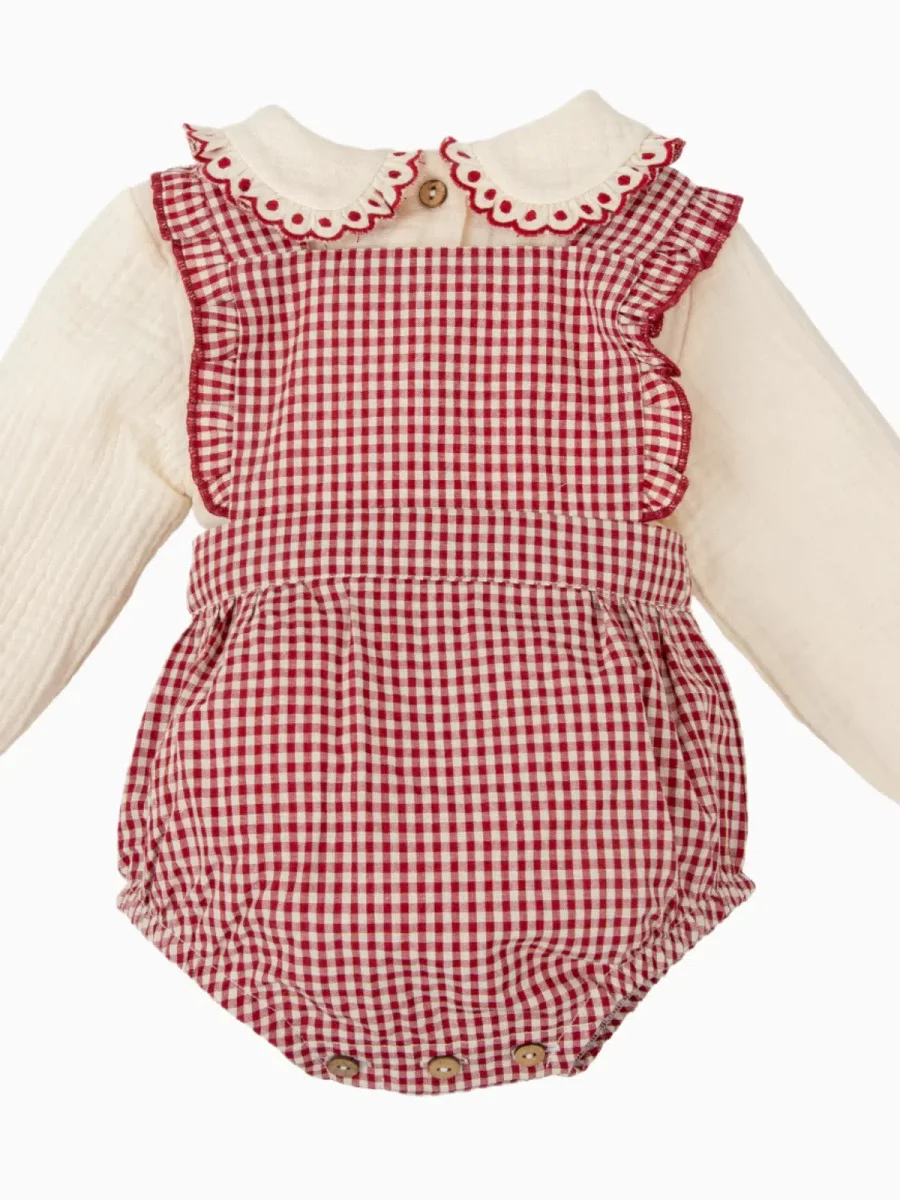 Fabriquée avec soin en Espagne, cette salopette incarne la qualité et le souci du détail. Le tissu vichy rouge est non seulement doux et confortable pour la peau délicate des bébés, mais il est également durable et facile à entretenir. Vous apprécierez la praticité de ce vêtement, conçu pour résister aux jeux et aux aventures de votre enfant tout en conservant son allure charmante.