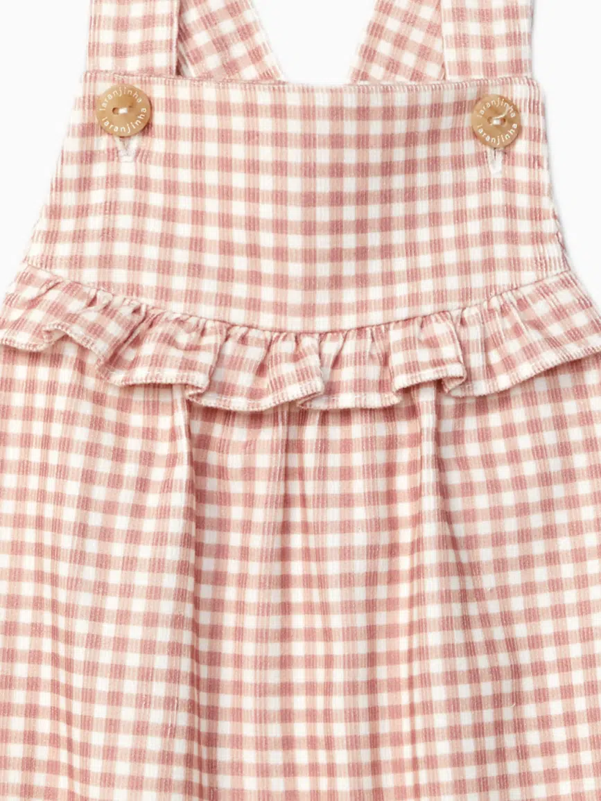 Craquez pour notre salopette fille en velours côtelé rose et blanc, une pièce délicate et intemporelle pour habiller votre bébé avec douceur et élégance. Son imprimé vichy raffiné et son volant sur la poitrine apportent une touche féminine discrète, tout en conservant le confort et la praticité essentiels pour le quotidien des tout-petits.