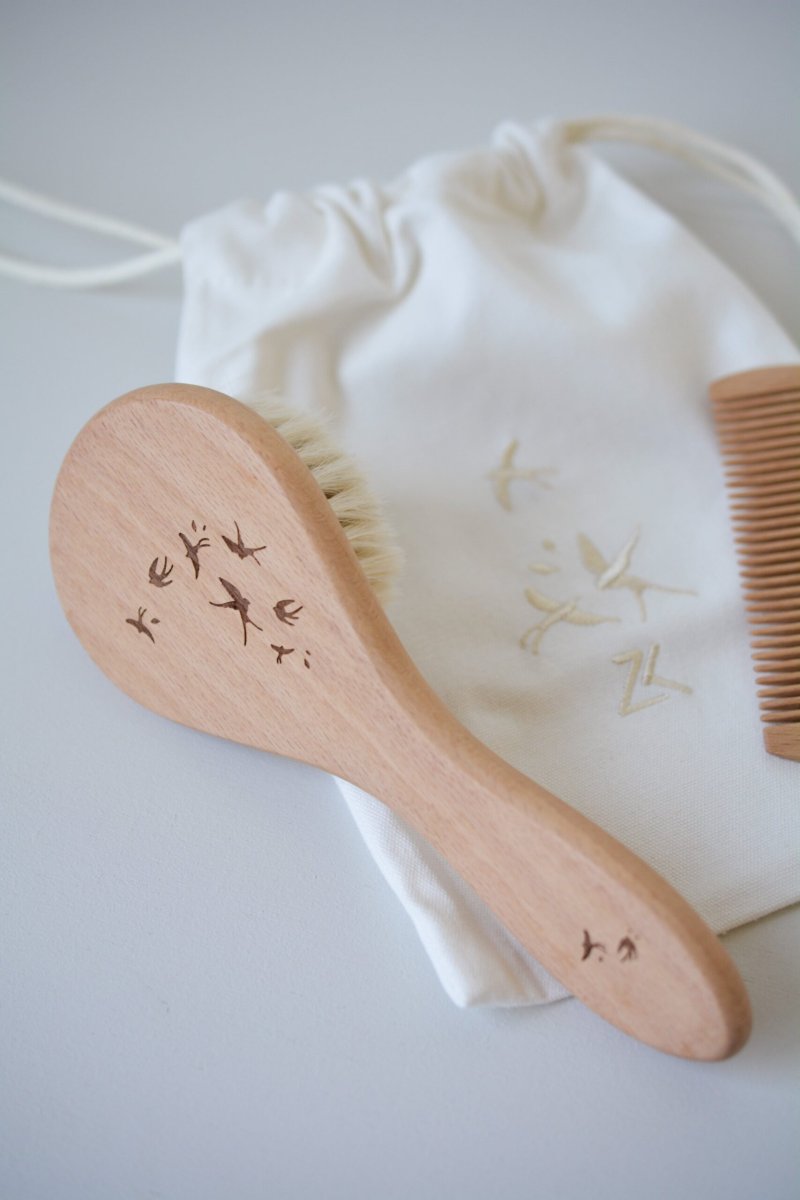 On craque pour ce joli Set de brosse et peigne pour bébé en bois 100% naturel de ZAKUW ! Avec sa gravure hirondelles et son élégant pochon de rangement brodé, c’est le parfait cadeau de naissance à (s’) offrir !