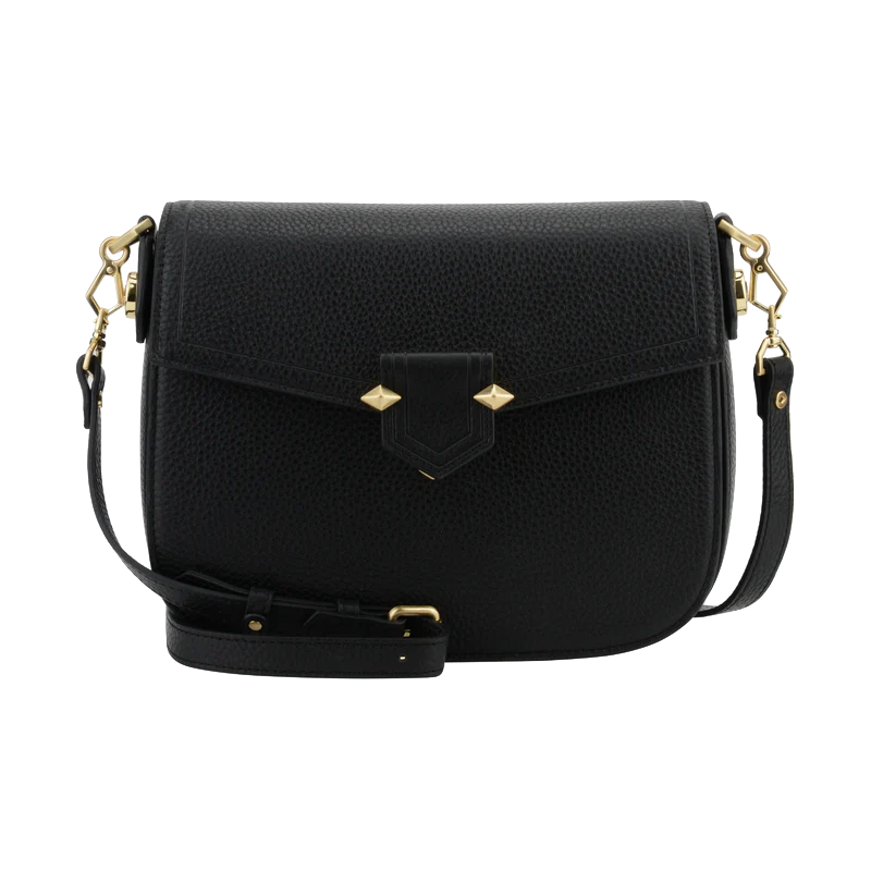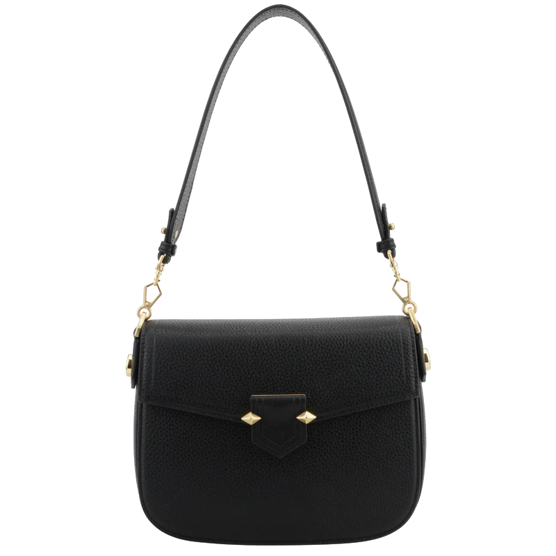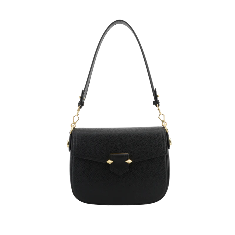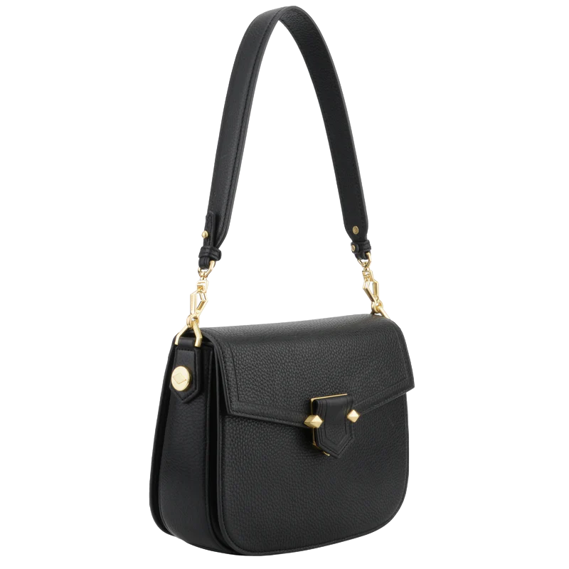 Les éléments en métal doré contrastent élégamment avec le cuir noir, tandis que les finitions soignées et les coutures discrètes témoignent de la qualité de fabrication. Ce modèle est parfait pour une utilisation quotidienne ou pour des occasions spéciales, offrant à la fois style et fonctionnalité.