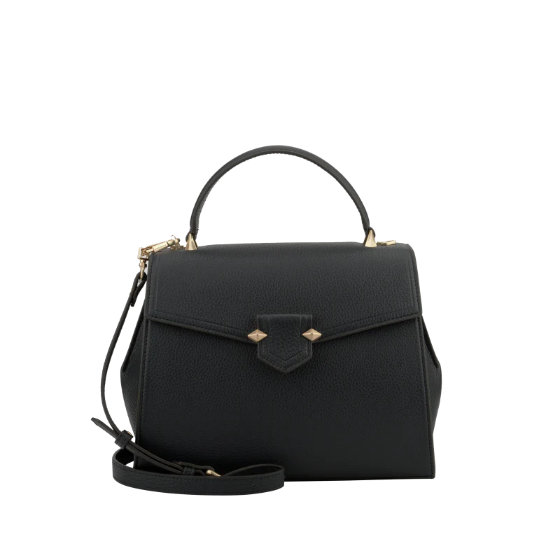 Le design est complété par une poignée supérieure pour un port à la main et une bandoulière amovible et réglable qui permet de le porter à l’épaule ou en travers. Les détails en métal doré, tels que les clous décoratifs et la fermeture, ajoutent une touche de luxe et de modernité à l’ensemble.