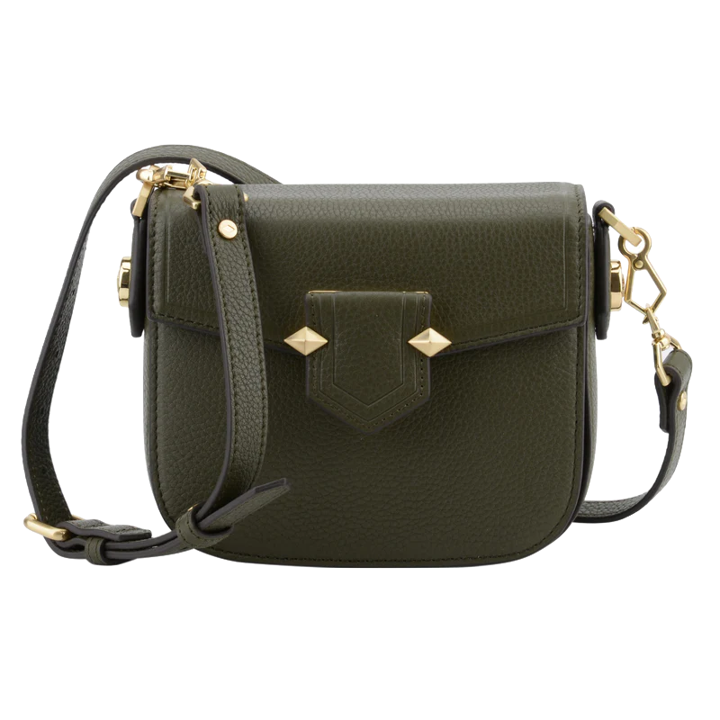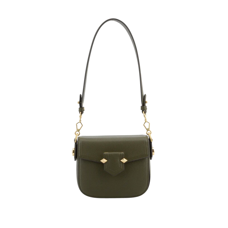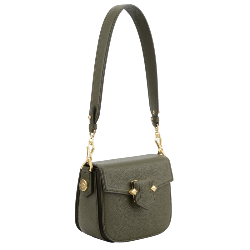 Confectionné en cuir de veau grainé, ce sac offre une sensation de luxe tout en garantissant une résistance à l’usure quotidienne. Sa silhouette carrée avec des bords arrondis crée un look sophistiqué, tandis que les fermoirs dorés en forme de pyramide apportent une note d’élégance.