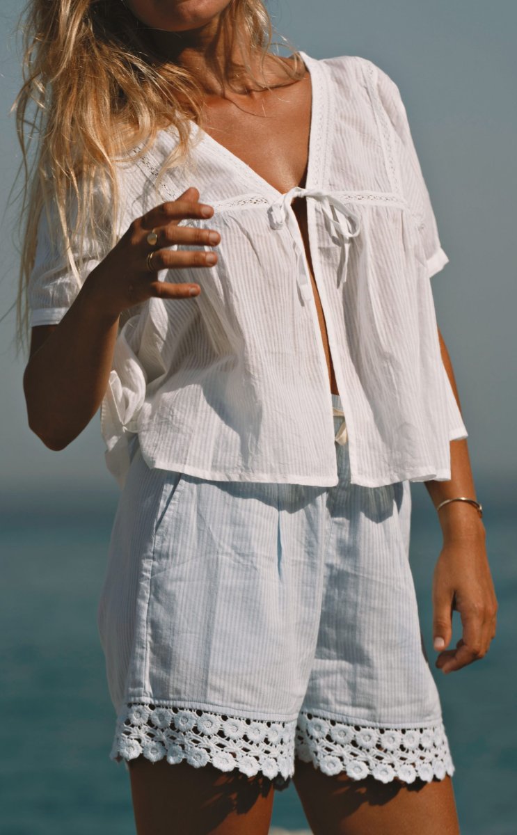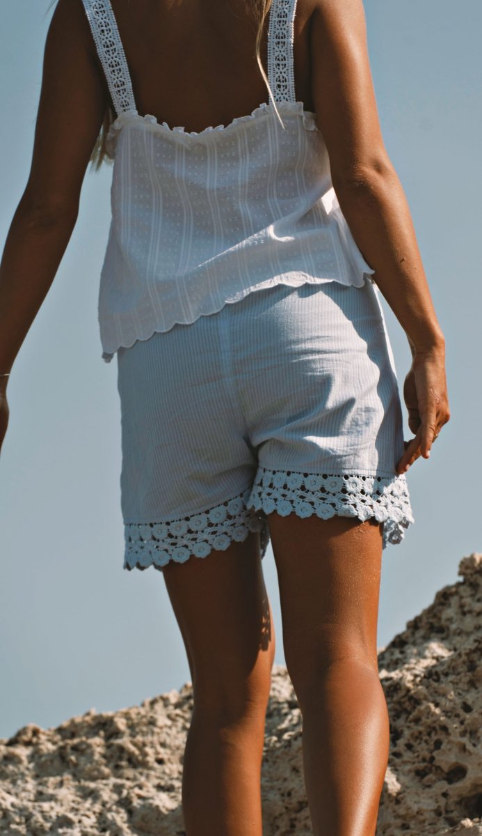 Sa taille élastique avec petit lien assure un ajustement parfait et confortable, tandis que la magnifique dentelle en coton sur le bas apporte tout le charme et la délicatesse de cette pièce. Une touche raffinée qui transforme un short simple en un indispensable poétique pour les beaux jours.